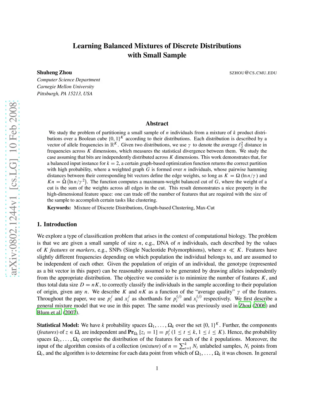 We study the problem of partitioning a small sample of individuals from a mixture of product distributions over a Boolean cube according to their distributions. Each distribution is described by a vector of allele frequencies in . Given two distributions, we use to denote the average distance in frequencies across dimensions, which measures the statistical divergence between them. We study the case assuming that bits are independently distributed across dimensions. This work demonstrates that, for a balanced input instance for , a certain graph-based optimization function returns the correct partition with high probability, where a weighted graph is formed over individuals, whose pairwise hamming distances between their corresponding bit vectors define the edge weights, so long as and . The function computes a maximum-weight balanced cut of , where the weight of a cut is the sum of the weights across all edges in the cut. This result demonstrates a nice property in the high-dimensional feature space: one can trade off the number of features that are required with the size of the sample to accomplish certain tasks like clustering.
