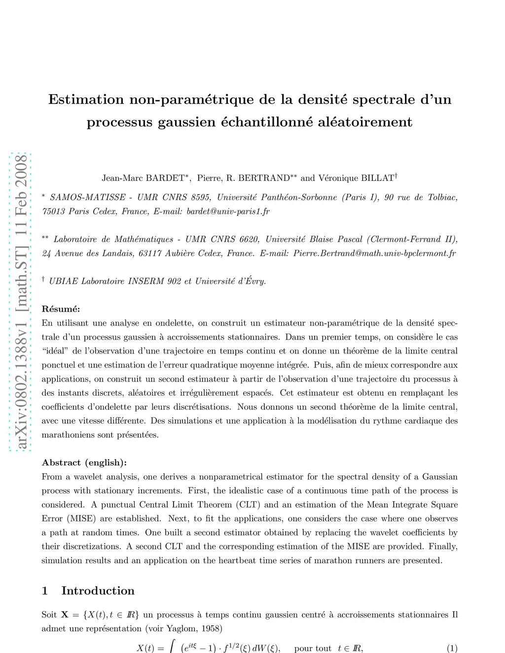 From a wavelet analysis, one derives a nonparametrical estimator for the spectral density of a Gaussian process with stationary increments. First, the idealistic case of a continuous time path of the process is considered. A punctual Central Limit Theorem (CLT) and an estimation of the Mean Integrate Square Error (MISE) are established. Next, to fit the applications, one considers the case where one observes a path at random times. One built a second estimator obtained by replacing the wavelet coefficients by their discretizations. A second CLT and the corresponding estimation of the MISE are provided. Finally, simulation results and an application on the heartbeat time series of marathon runners are presented.