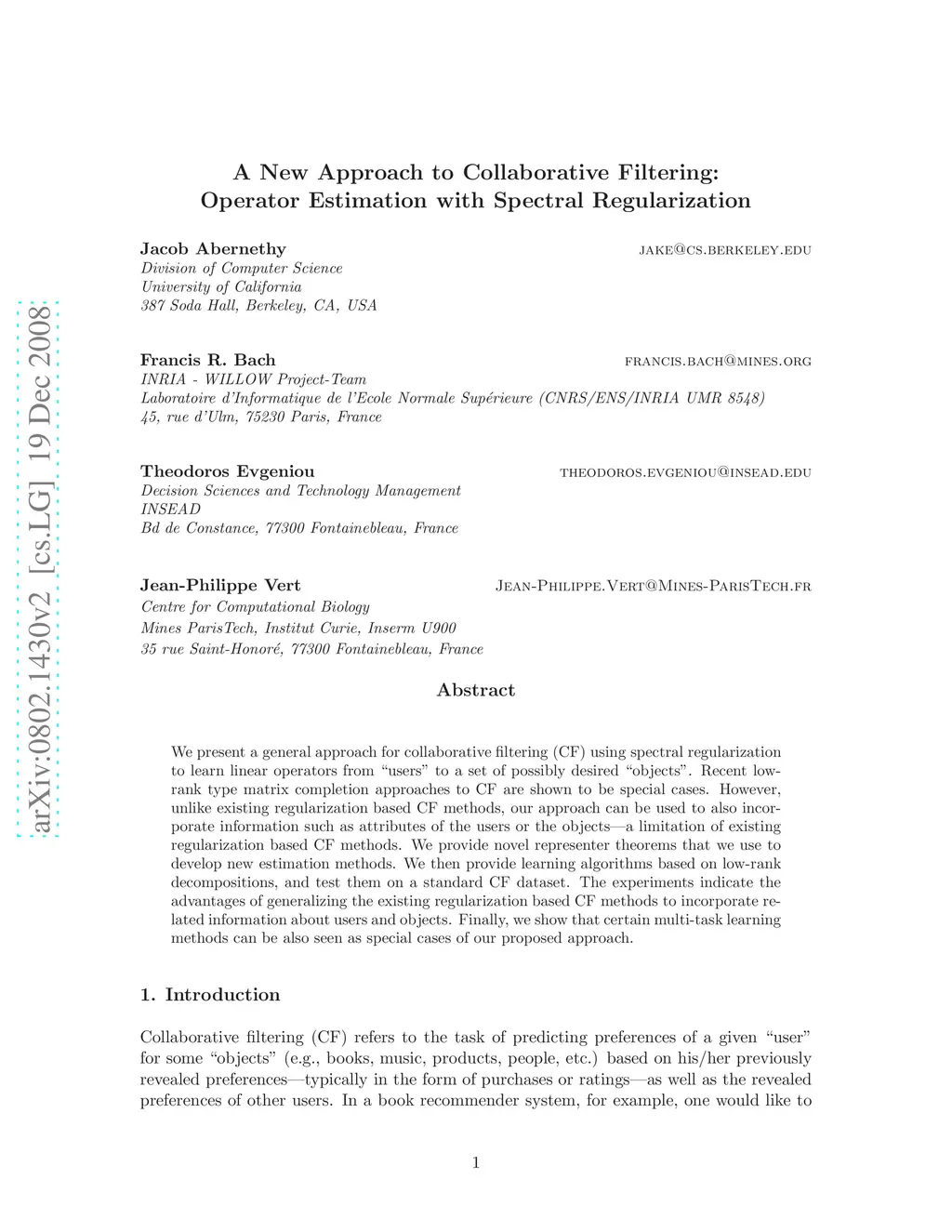 We present a general approach for collaborative filtering (CF) using spectral regularization to learn linear operators from "users" to the "objects" they rate. Recent low-rank type matrix completion approaches to CF are shown to be special cases. However, unlike existing regularization based CF methods, our approach can be used to also incorporate information such as attributes of the users or the objects -- a limitation of existing regularization based CF methods. We then provide novel representer theorems that we use to develop new estimation methods. We provide learning algorithms based on low-rank decompositions, and test them on a standard CF dataset. The experiments indicate the advantages of generalizing the existing regularization based CF methods to incorporate related information about users and objects. Finally, we show that certain multi-task learning methods can be also seen as special cases of our proposed approach.