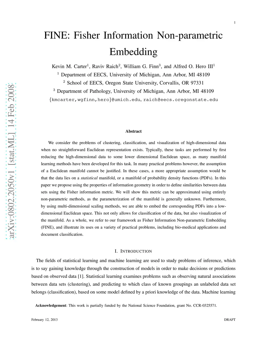 We consider the problems of clustering, classification, and visualization of high-dimensional data when no straightforward Euclidean representation exists. Typically, these tasks are performed by first reducing the high-dimensional data to some lower dimensional Euclidean space, as many manifold learning methods have been developed for this task. In many practical problems however, the assumption of a Euclidean manifold cannot be justified. In these cases, a more appropriate assumption would be that the data lies on a statistical manifold, or a manifold of probability density functions (PDFs). In this paper we propose using the properties of information geometry in order to define similarities between data sets using the Fisher information metric. We will show this metric can be approximated using entirely non-parametric methods, as the parameterization of the manifold is generally unknown. Furthermore, by using multi-dimensional scaling methods, we are able to embed the corresponding PDFs into a low-dimensional Euclidean space. This not only allows for classification of the data, but also visualization of the manifold. As a whole, we refer to our framework as Fisher Information Non-parametric Embedding (FINE), and illustrate its uses on a variety of practical problems, including bio-medical applications and document classification.