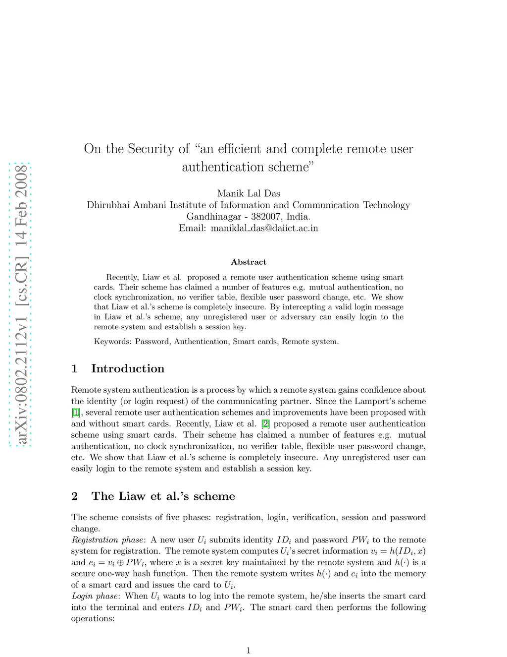 Recently, Liaw et al. proposed a remote user authentication scheme using smart cards. Their scheme has claimed a number of features e.g. mutual authentication, no clock synchronization, no verifier table, flexible user password change, etc. We show that Liaw et al.'s scheme is completely insecure. By intercepting a valid login message in Liaw et al.'s scheme, any unregistered user or adversary can easily login to the remote system and establish a session key.