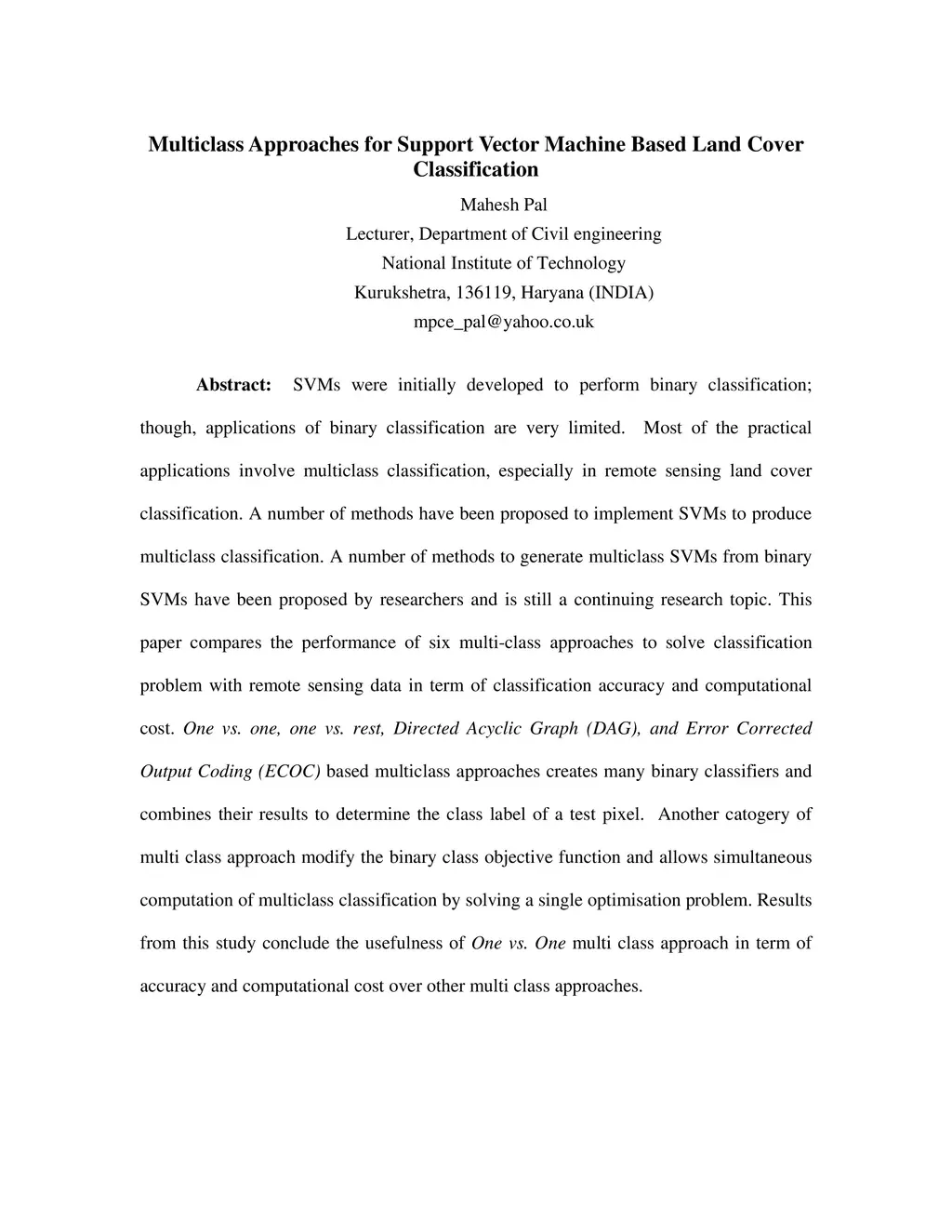 SVMs were initially developed to perform binary classification; though, applications of binary classification are very limited. Most of the practical applications involve multiclass classification, especially in remote sensing land cover classification. A number of methods have been proposed to implement SVMs to produce multiclass classification. A number of methods to generate multiclass SVMs from binary SVMs have been proposed by researchers and is still a continuing research topic. This paper compares the performance of six multi-class approaches to solve classification problem with remote sensing data in term of classification accuracy and computational cost. One vs. one, one vs. rest, Directed Acyclic Graph (DAG), and Error Corrected Output Coding (ECOC) based multiclass approaches creates many binary classifiers and combines their results to determine the class label of a test pixel. Another catogery of multi class approach modify the binary class objective function and allows simultaneous computation of multiclass classification by solving a single optimisation problem. Results from this study conclude the usefulness of One vs. One multi class approach in term of accuracy and computational cost over other multi class approaches.