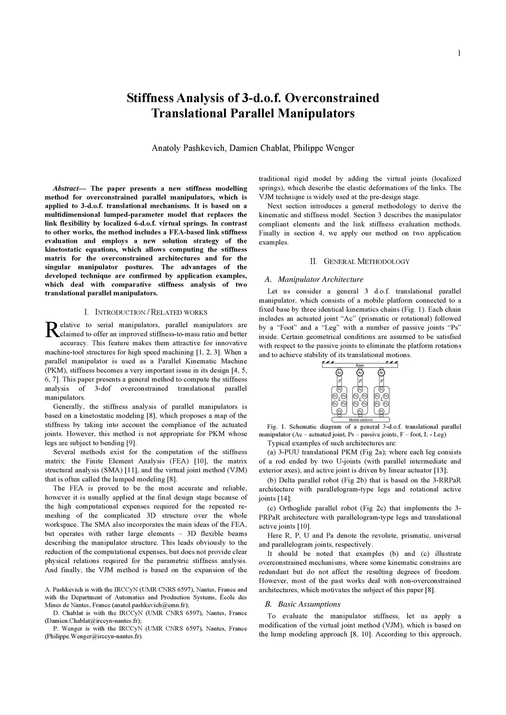 The paper presents a new stiffness modelling method for overconstrained parallel manipulators, which is applied to 3-d.o.f. translational mechanisms. It is based on a multidimensional lumped-parameter model that replaces the link flexibility by localized 6-d.o.f. virtual springs. In contrast to other works, the method includes a FEA-based link stiffness evaluation and employs a new solution strategy of the kinetostatic equations, which allows computing the stiffness matrix for the overconstrained architectures and for the singular manipulator postures. The advantages of the developed technique are confirmed by application examples, which deal with comparative stiffness analysis of two translational parallel manipulators.