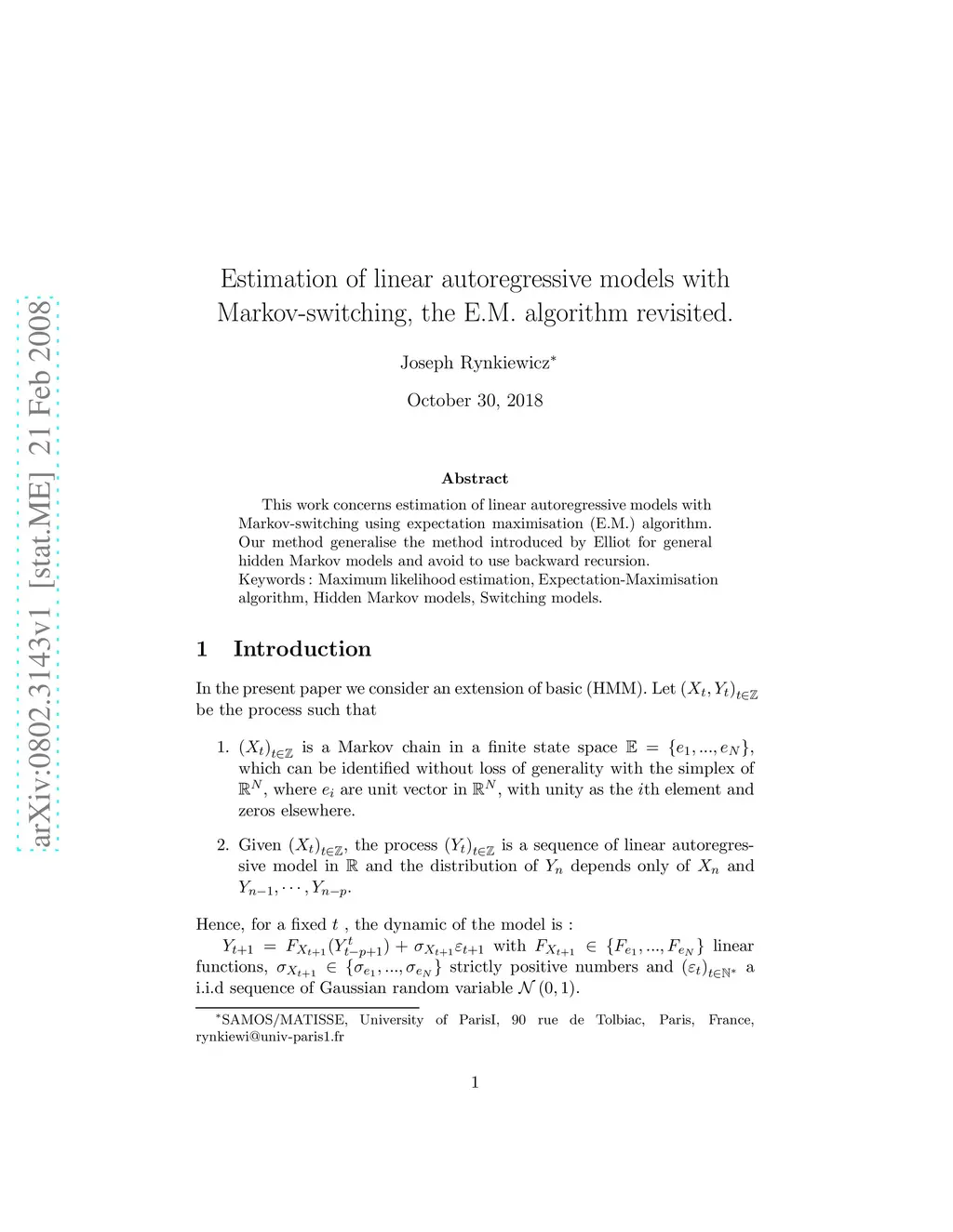 This work concerns estimation of linear autoregressive models with Markov-switching using expectation maximisation (E.M.) algorithm. Our method generalise the method introduced by Elliot for general hidden Markov models and avoid to use backward recursion.