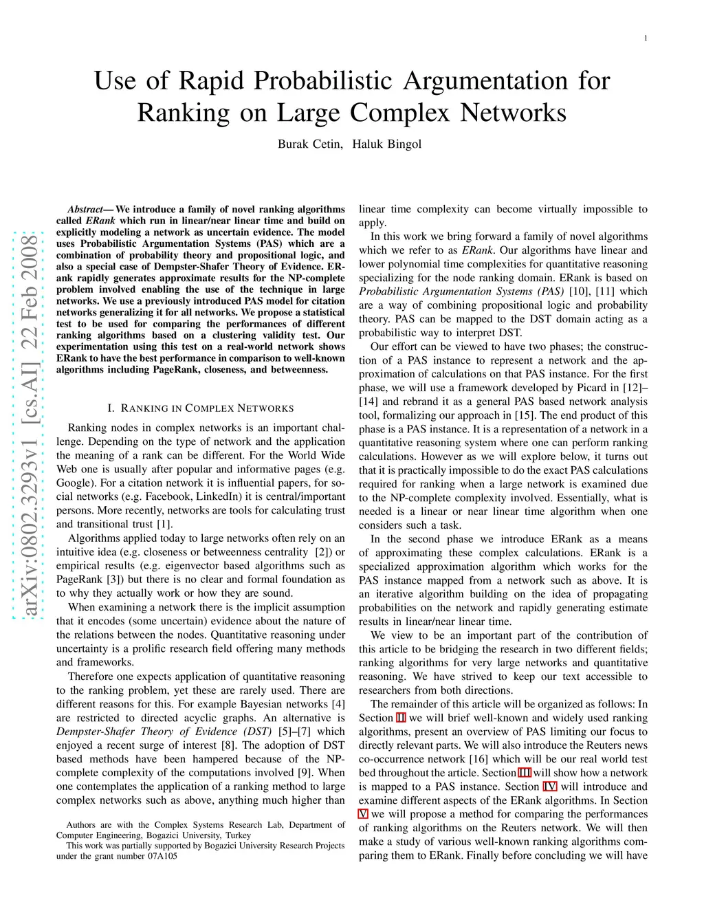 We introduce a family of novel ranking algorithms called ERank which run in linear/near linear time and build on explicitly modeling a network as uncertain evidence. The model uses Probabilistic Argumentation Systems (PAS) which are a combination of probability theory and propositional logic, and also a special case of Dempster-Shafer Theory of Evidence. ERank rapidly generates approximate results for the NP-complete problem involved enabling the use of the technique in large networks. We use a previously introduced PAS model for citation networks generalizing it for all networks. We propose a statistical test to be used for comparing the performances of different ranking algorithms based on a clustering validity test. Our experimentation using this test on a real-world network shows ERank to have the best performance in comparison to well-known algorithms including PageRank, closeness, and betweenness.