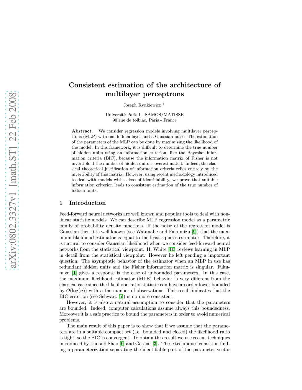 We consider regression models involving multilayer perceptrons (MLP) with one hidden layer and a Gaussian noise. The estimation of the parameters of the MLP can be done by maximizing the likelihood of the model. In this framework, it is difficult to determine the true number of hidden units using an information criterion, like the Bayesian information criteria (BIC), because the information matrix of Fisher is not invertible if the number of hidden units is overestimated. Indeed, the classical theoretical justification of information criteria relies entirely on the invertibility of this matrix. However, using recent methodology introduced to deal with models with a loss of identifiability, we prove that suitable information criterion leads to consistent estimation of the true number of hidden units.