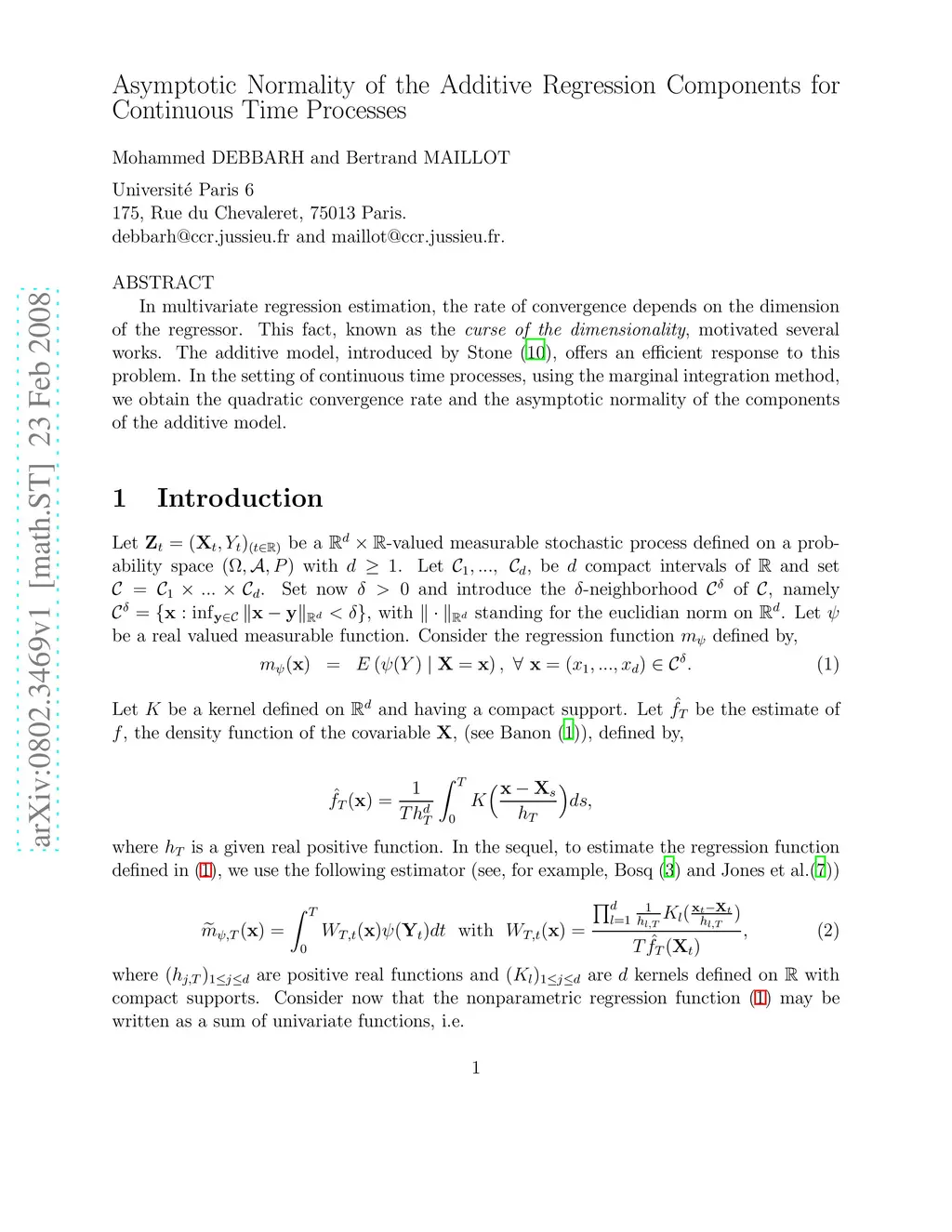 In multivariate regression estimation, the rate of convergence depends on the dimension of the regressor. This fact, known as the curse of the dimensionality, motivated several works. The additive model, introduced by Stone (10), offers an efficient response to this problem. In the setting of continuous time processes, using the marginal integration method, we obtain the quadratic convergence rate and the asymptotic normality of the components of the additive model.