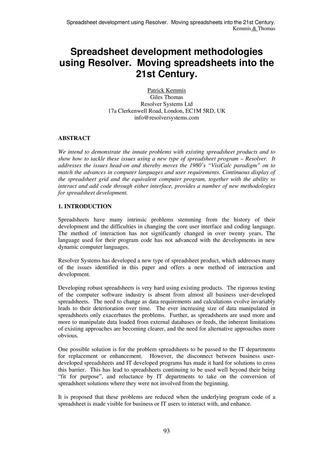 We intend to demonstrate the innate problems with existing spreadsheet products and to show how to tackle these issues using a new type of spreadsheet program called Resolver. It addresses the issues head-on and thereby moves the 1980's "VisiCalc paradigm" on to match the advances in computer languages and user requirements. Continuous display of the spreadsheet grid and the equivalent computer program, together with the ability to interact and add code through either interface, provides a number of new methodologies for spreadsheet development.