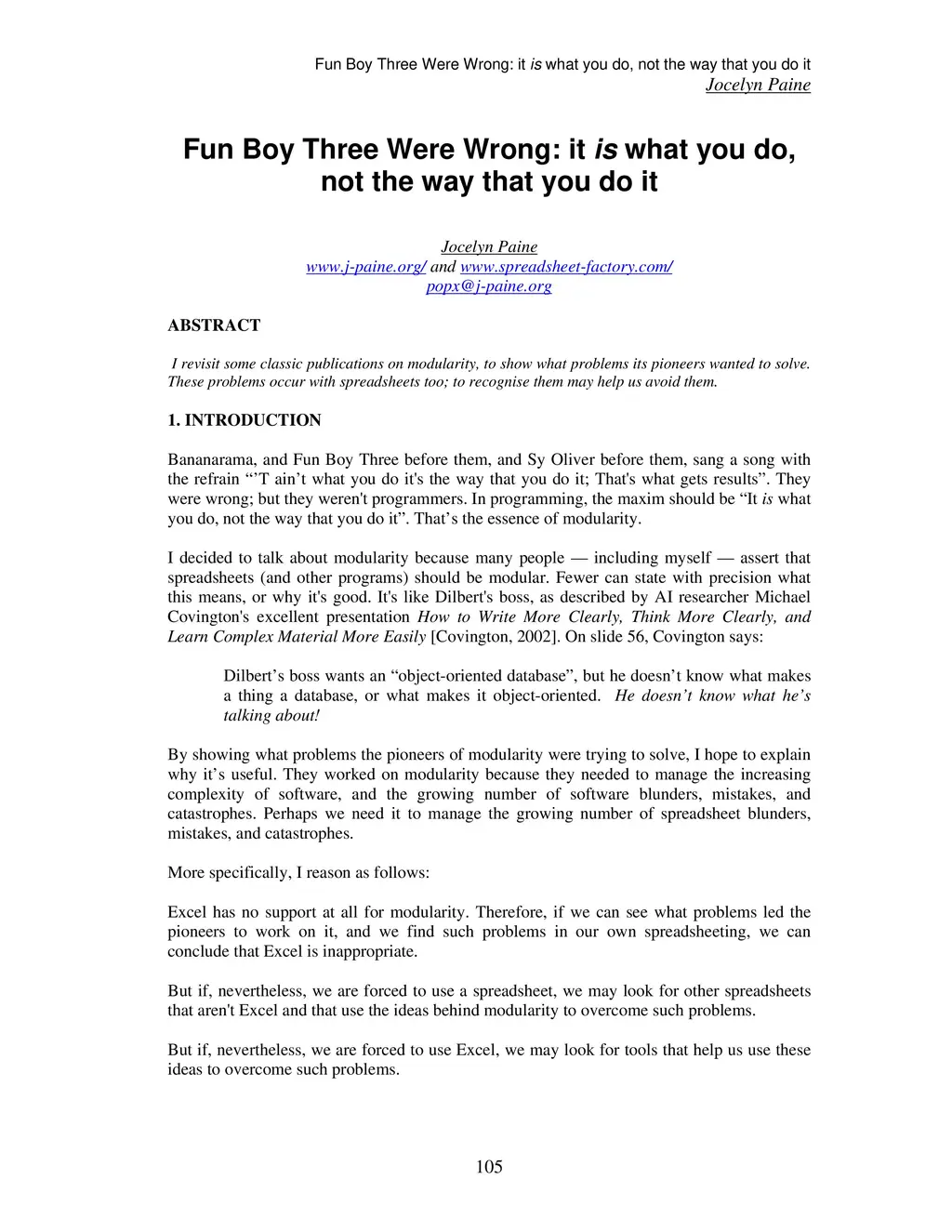 I revisit some classic publications on modularity, to show what problems its pioneers wanted to solve. These problems occur with spreadsheets too: to recognise them may help us avoid them.