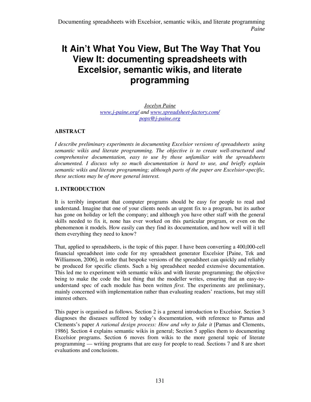 I describe preliminary experiments in documenting Excelsior versions of spreadsheets using semantic wikis and literate programming. The objective is to create well-structured and comprehensive documentation, easy to use by those unfamiliar with the spreadsheets documented. I discuss why so much documentation is hard to use, and briefly explain semantic wikis and literate programming; although parts of the paper are Excelsior-specific, these sections may be of more general interest.