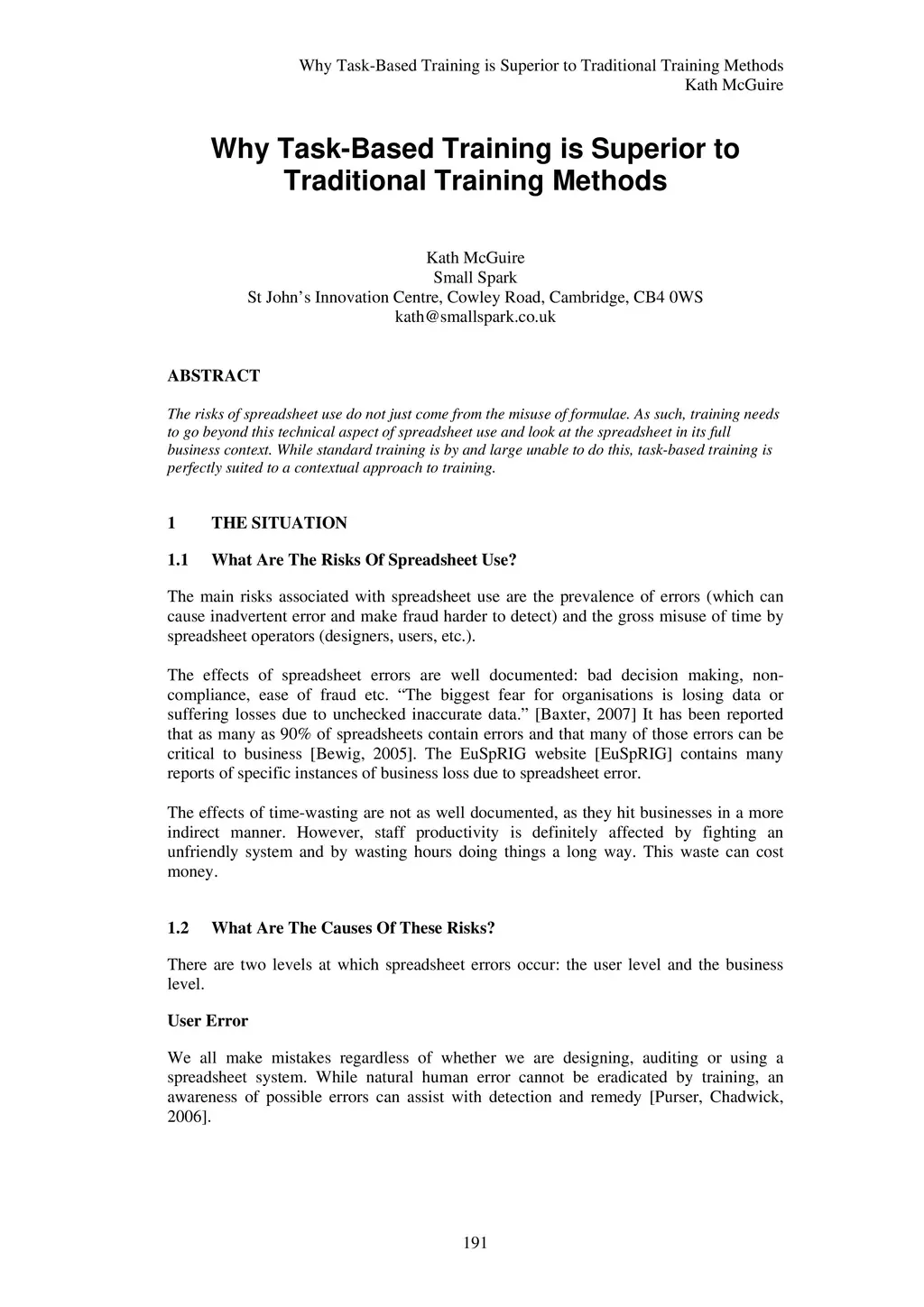 The risks of spreadsheet use do not just come from the misuse of formulae. As such, training needs to go beyond this technical aspect of spreadsheet use and look at the spreadsheet in its full business context. While standard training is by and large unable to do this, task-based training is perfectly suited to a contextual approach to training.