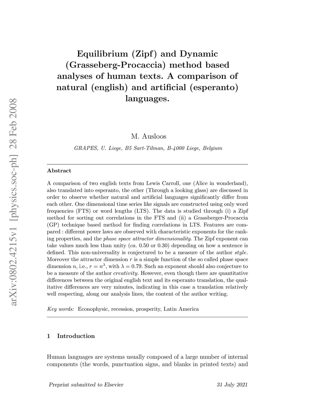 A comparison of two english texts from Lewis Carroll, one (Alice in wonderland), also translated into esperanto, the other (Through a looking glass) are discussed in order to observe whether natural and artificial languages significantly differ from each other. One dimensional time series like signals are constructed using only word frequencies (FTS) or word lengths (LTS). The data is studied through (i) a Zipf method for sorting out correlations in the FTS and (ii) a Grassberger-Procaccia (GP) technique based method for finding correlations in LTS. Features are compared : different power laws are observed with characteristic exponents for the ranking properties, and the {\it phase space attractor dimensionality}. The Zipf exponent can take values much less than unity ( 0.50 or 0.30) depending on how a sentence is defined. This non-universality is conjectured to be a measure of the author . Moreover the attractor dimension is a simple function of the so called phase space dimension , i.e., , with . Such an exponent should also conjecture to be a measure of the author . However, even though there are quantitative differences between the original english text and its esperanto translation, the qualitative differences are very minutes, indicating in this case a translation relatively well respecting, along our analysis lines, the content of the author writing.