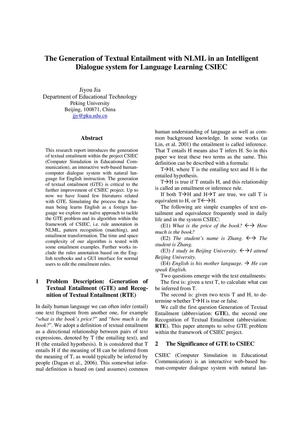 This research report introduces the generation of textual entailment within the project CSIEC (Computer Simulation in Educational Communication), an interactive web-based human-computer dialogue system with natural language for English instruction. The generation of textual entailment (GTE) is critical to the further improvement of CSIEC project. Up to now we have found few literatures related with GTE. Simulating the process that a human being learns English as a foreign language we explore our naive approach to tackle the GTE problem and its algorithm within the framework of CSIEC, i.e. rule annotation in NLML, pattern recognition (matching), and entailment transformation. The time and space complexity of our algorithm is tested with some entailment examples. Further works include the rules annotation based on the English textbooks and a GUI interface for normal users to edit the entailment rules.