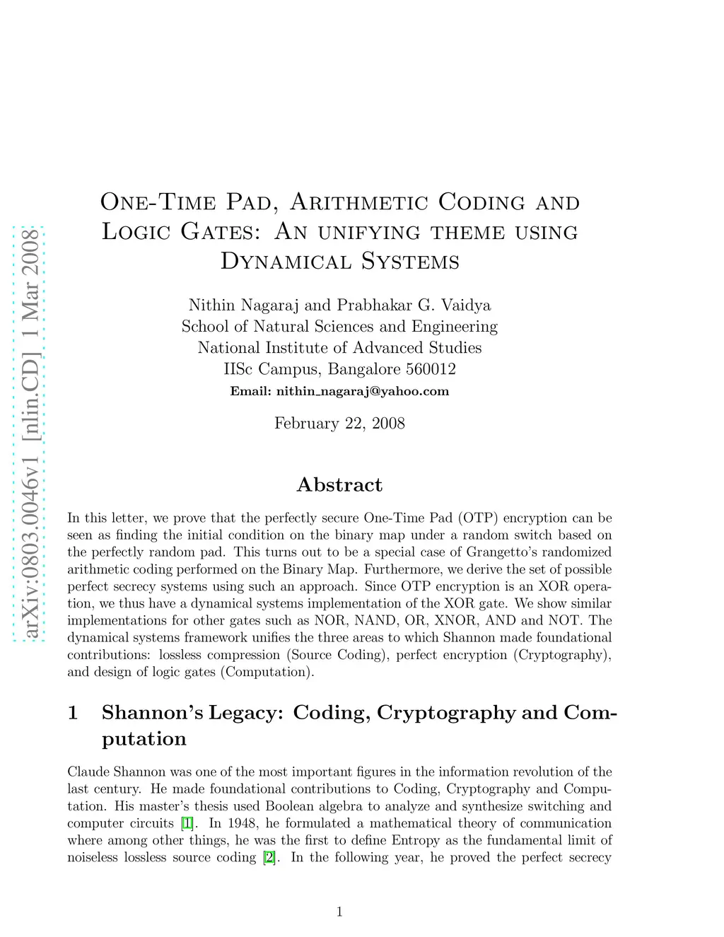 In this letter, we prove that the perfectly secure One-Time Pad (OTP) encryption can be seen as finding the initial condition on the binary map under a random switch based on the perfectly random pad. This turns out to be a special case of Grangetto's randomized arithmetic coding performed on the Binary Map. Furthermore, we derive the set of possible perfect secrecy systems using such an approach. Since OTP encryption is an XOR operation, we thus have a dynamical systems implementation of the XOR gate. We show similar implementations for other gates such as NOR, NAND, OR, XNOR, AND and NOT. The dynamical systems framework unifies the three areas to which Shannon made foundational contributions: lossless compression (Source Coding), perfect encryption (Cryptography), and design of logic gates (Computation)