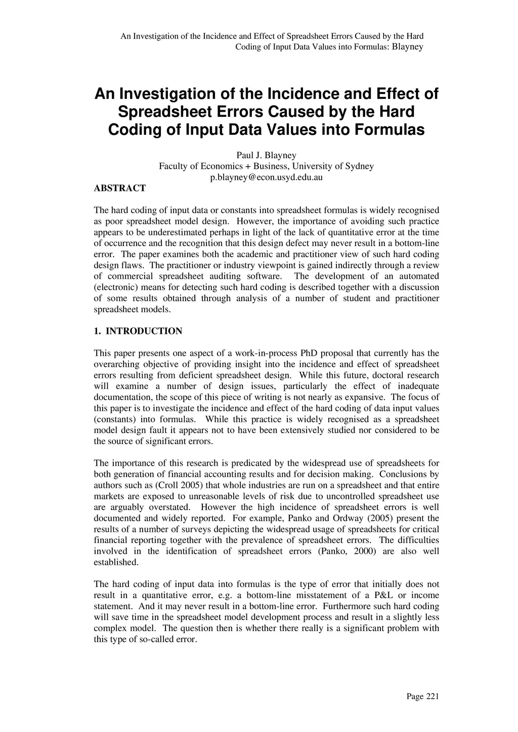 The hard coding of input data or constants into spreadsheet formulas is widely recognised as poor spreadsheet model design. However, the importance of avoiding such practice appears to be underestimated perhaps in light of the lack of quantitative error at the time of occurrence and the recognition that this design defect may never result in a bottom-line error. The paper examines both the academic and practitioner view of such hard coding design flaws. The practitioner or industry viewpoint is gained indirectly through a review of commercial spreadsheet auditing software. The development of an automated (electronic) means for detecting such hard coding is described together with a discussion of some results obtained through analysis of a number of student and practitioner spreadsheet models.