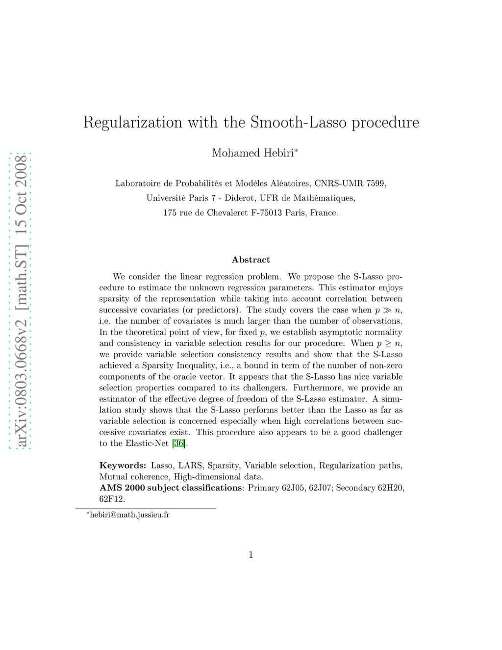 We consider the linear regression problem. We propose the S-Lasso procedure to estimate the unknown regression parameters. This estimator enjoys sparsity of the representation while taking into account correlation between successive covariates (or predictors). The study covers the case when , i.e. the number of covariates is much larger than the number of observations. In the theoretical point of view, for fixed , we establish asymptotic normality and consistency in variable selection results for our procedure. When , we provide variable selection consistency results and show that the S-Lasso achieved a Sparsity Inequality, i.e., a bound in term of the number of non-zero components of the oracle vector. It appears that the S-Lasso has nice variable selection properties compared to its challengers. Furthermore, we provide an estimator of the effective degree of freedom of the S-Lasso estimator. A simulation study shows that the S-Lasso performs better than the Lasso as far as variable selection is concerned especially when high correlations between successive covariates exist. This procedure also appears to be a good challenger to the Elastic-Net (Zou and Hastie, 2005).