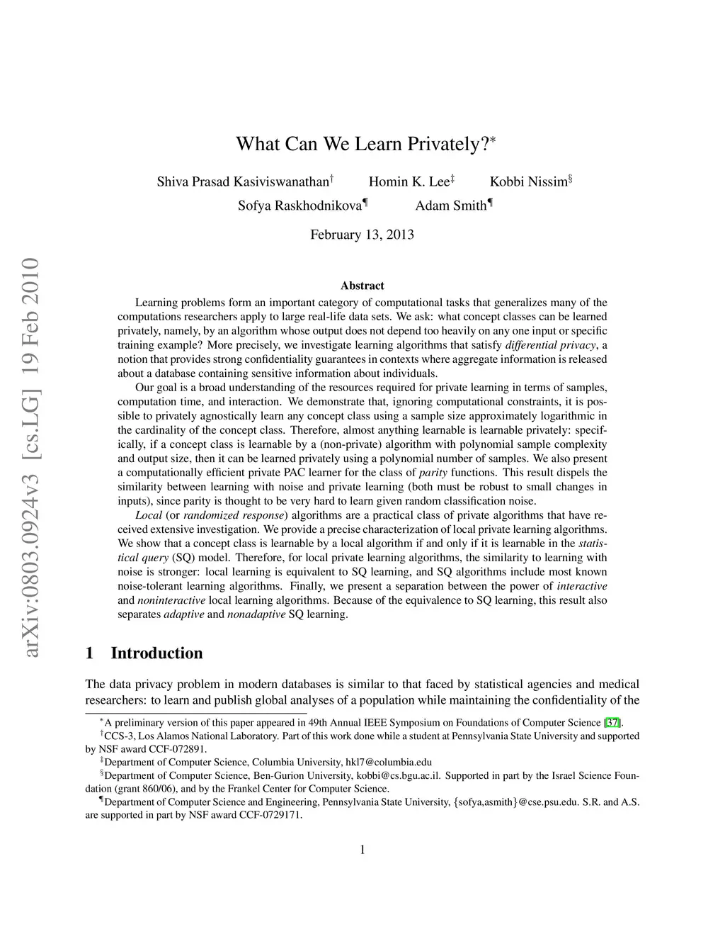 Learning problems form an important category of computational tasks that generalizes many of the computations researchers apply to large real-life data sets. We ask: what concept classes can be learned privately, namely, by an algorithm whose output does not depend too heavily on any one input or specific training example? More precisely, we investigate learning algorithms that satisfy differential privacy, a notion that provides strong confidentiality guarantees in contexts where aggregate information is released about a database containing sensitive information about individuals. We demonstrate that, ignoring computational constraints, it is possible to privately agnostically learn any concept class using a sample size approximately logarithmic in the cardinality of the concept class. Therefore, almost anything learnable is learnable privately: specifically, if a concept class is learnable by a (non-private) algorithm with polynomial sample complexity and output size, then it can be learned privately using a polynomial number of samples. We also present a computationally efficient private PAC learner for the class of parity functions. Local (or randomized response) algorithms are a practical class of private algorithms that have received extensive investigation. We provide a precise characterization of local private learning algorithms. We show that a concept class is learnable by a local algorithm if and only if it is learnable in the statistical query (SQ) model. Finally, we present a separation between the power of interactive and noninteractive local learning algorithms.