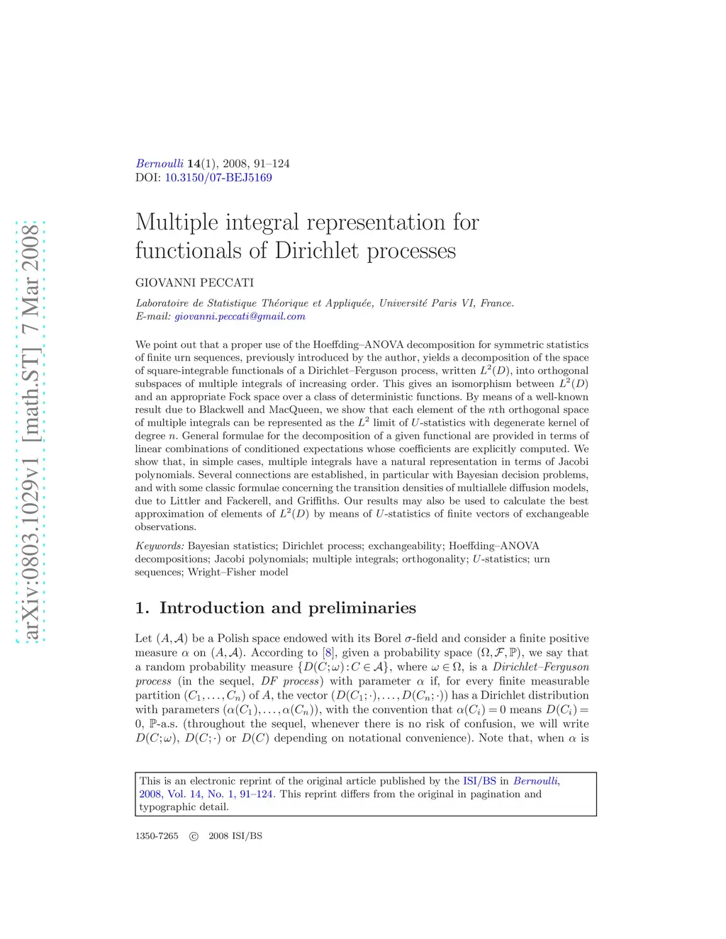 We point out that a proper use of the Hoeffding--ANOVA decomposition for symmetric statistics of finite urn sequences, previously introduced by the author, yields a decomposition of the space of square-integrable functionals of a Dirichlet--Ferguson process, written , into orthogonal subspaces of multiple integrals of increasing order. This gives an isomorphism between and an appropriate Fock space over a class of deterministic functions. By means of a well-known result due to Blackwell and MacQueen, we show that each element of the th orthogonal space of multiple integrals can be represented as the limit of -statistics with degenerate kernel of degree . General formulae for the decomposition of a given functional are provided in terms of linear combinations of conditioned expectations whose coefficients are explicitly computed. We show that, in simple cases, multiple integrals have a natural representation in terms of Jacobi polynomials. Several connections are established, in particular with Bayesian decision problems, and with some classic formulae concerning the transition densities of multiallele diffusion models, due to Littler and Fackerell, and Griffiths. Our results may also be used to calculate the best approximation of elements of by means of -statistics of finite vectors of exchangeable observations.