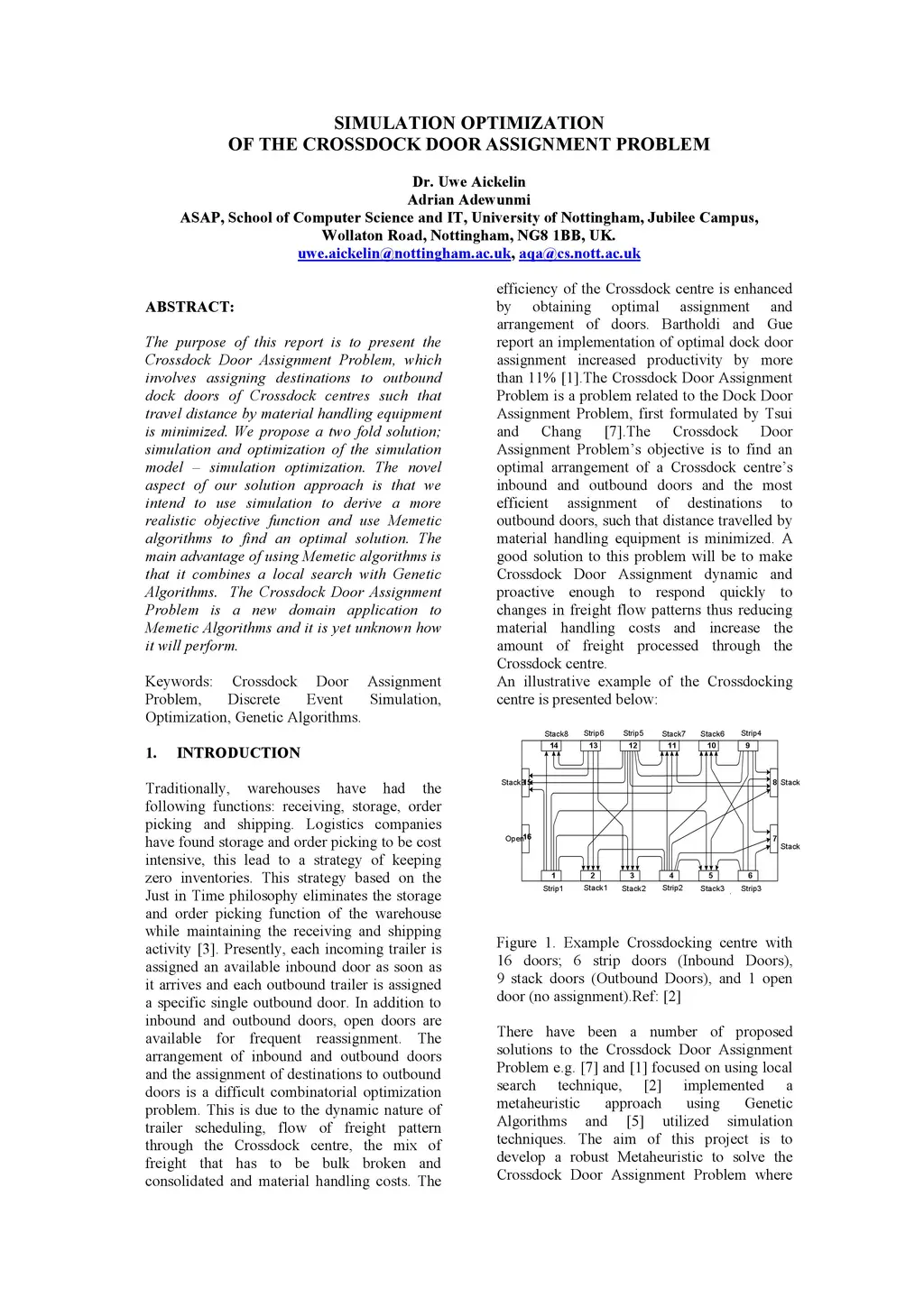 The purpose of this report is to present the Crossdock Door Assignment Problem, which involves assigning destinations to outbound dock doors of Crossdock centres such that travel distance by material handling equipment is minimized. We propose a two fold solution; simulation and optimization of the simulation model simulation optimization. The novel aspect of our solution approach is that we intend to use simulation to derive a more realistic objective function and use Memetic algorithms to find an optimal solution. The main advantage of using Memetic algorithms is that it combines a local search with Genetic Algorithms. The Crossdock Door Assignment Problem is a new domain application to Memetic Algorithms and it is yet unknown how it will perform.
