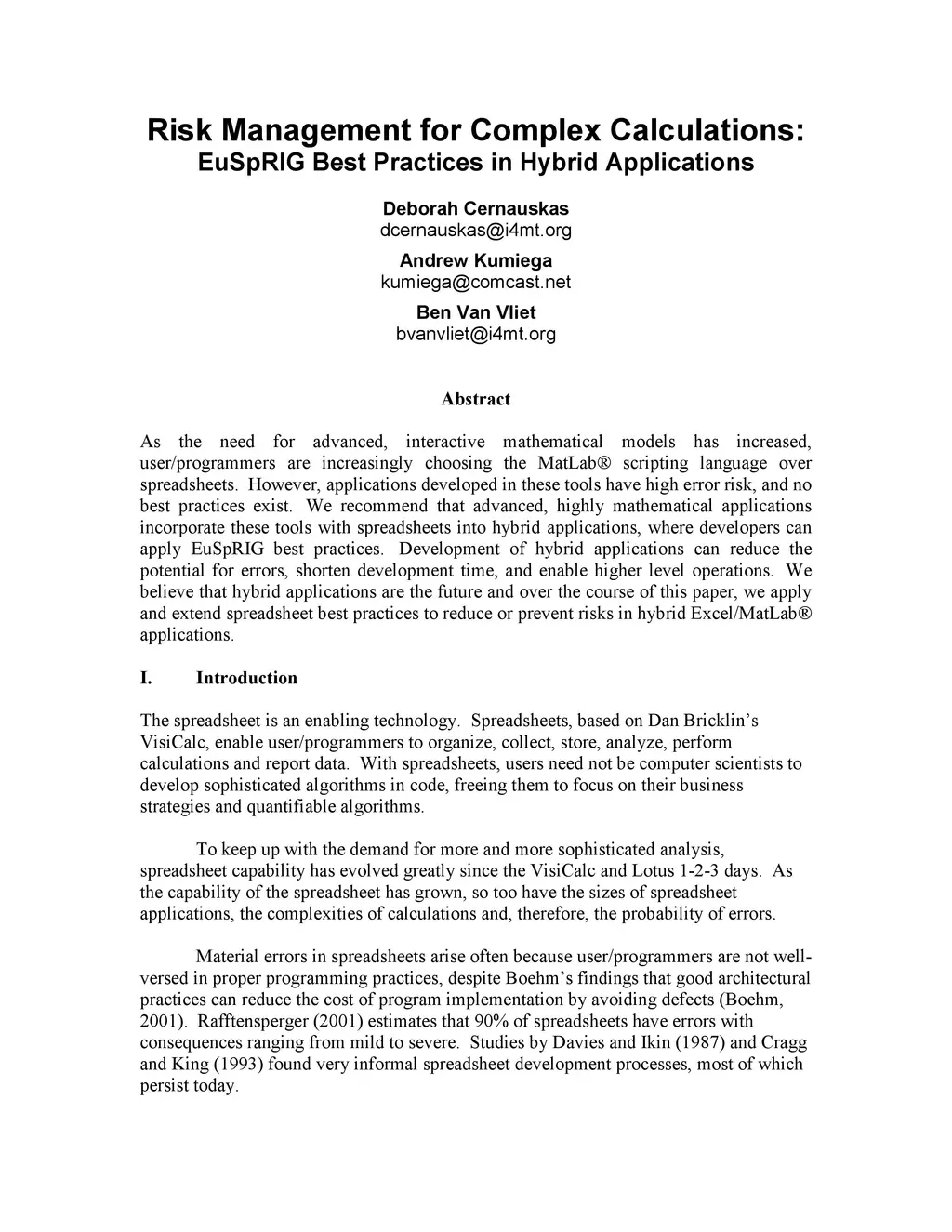 Risk Management for Complex Calculations: EuSpRIG Best Practices in