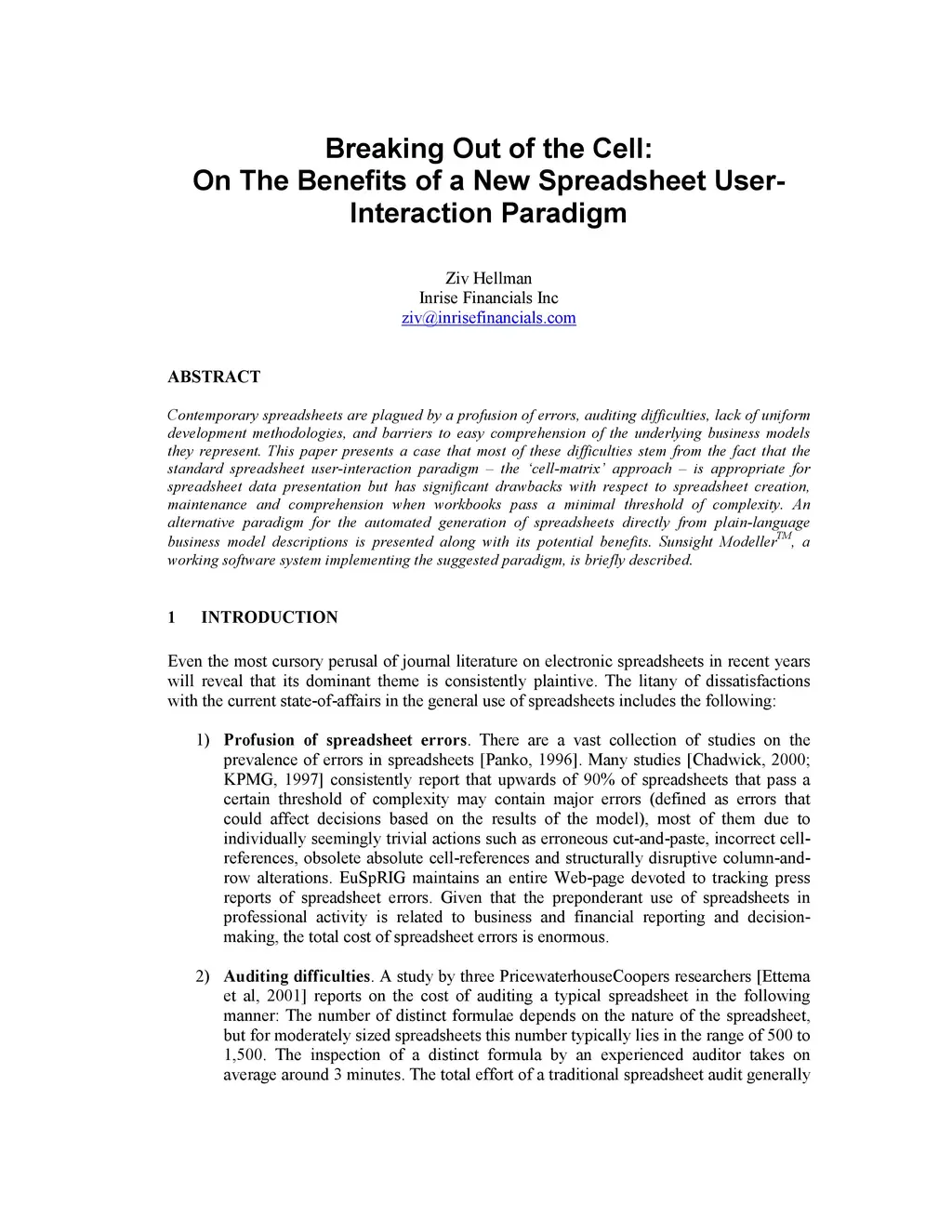Contemporary spreadsheets are plagued by a profusion of errors, auditing difficulties, lack of uniform development methodologies, and barriers to easy comprehension of the underlying business models they represent. This paper presents a case that most of these difficulties stem from the fact that the standard spreadsheet user-interaction paradigm - the 'cell-matrix' approach - is appropriate for spreadsheet data presentation but has significant drawbacks with respect to spreadsheet creation, maintenance and comprehension when workbooks pass a minimal threshold of complexity. An alternative paradigm for the automated generation of spreadsheets directly from plain-language business model descriptions is presented along with its potential benefits. Sunsight Modeller (TM), a working software system implementing the suggested paradigm, is briefly described.