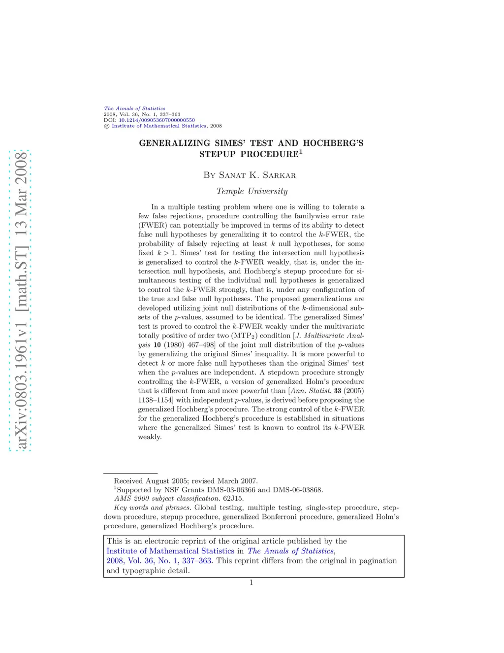 In a multiple testing problem where one is willing to tolerate a few false rejections, procedure controlling the familywise error rate (FWER) can potentially be improved in terms of its ability to detect false null hypotheses by generalizing it to control the -FWER, the probability of falsely rejecting at least null hypotheses, for some fixed . Simes' test for testing the intersection null hypothesis is generalized to control the -FWER weakly, that is, under the intersection null hypothesis, and Hochberg's stepup procedure for simultaneous testing of the individual null hypotheses is generalized to control the -FWER strongly, that is, under any configuration of the true and false null hypotheses. The proposed generalizations are developed utilizing joint null distributions of the -dimensional subsets of the -values, assumed to be identical. The generalized Simes' test is proved to control the -FWER weakly under the multivariate totally positive of order two (MTP) condition [J. Multivariate Analysis 10 (1980) 467--498] of the joint null distribution of the -values by generalizing the original Simes' inequality. It is more powerful to detect or more false null hypotheses than the original Simes' test when the -values are independent. A stepdown procedure strongly controlling the -FWER, a version of generalized Holm's procedure that is different from and more powerful than [Ann. Statist. 33 (2005) 1138--1154] with independent -values, is derived before proposing the generalized Hochberg's procedure. The strong control of the -FWER for the generalized Hochberg's procedure is established in situations where the generalized Simes' test is known to control its -FWER weakly.