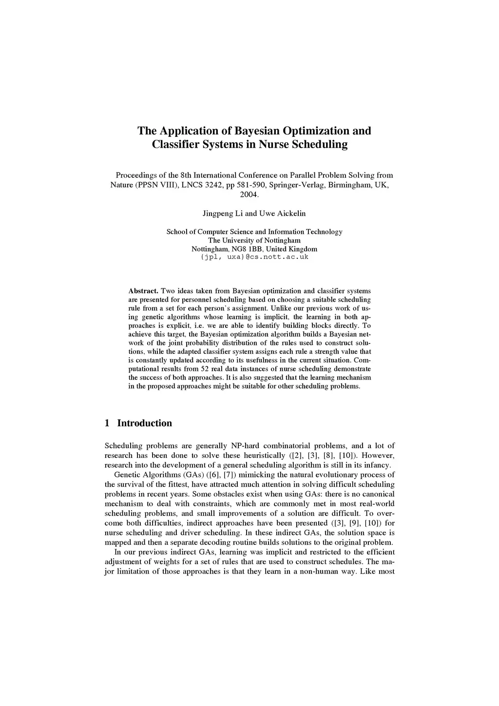 The Application of Bayesian Optimization and Classifier Systems in Nurse