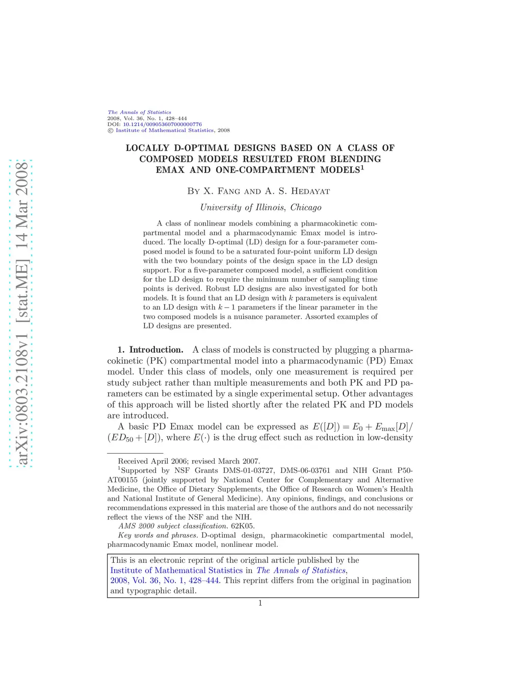 A class of nonlinear models combining a pharmacokinetic compartmental model and a pharmacodynamic Emax model is introduced. The locally D-optimal (LD) design for a four-parameter composed model is found to be a saturated four-point uniform LD design with the two boundary points of the design space in the LD design support. For a five-parameter composed model, a sufficient condition for the LD design to require the minimum number of sampling time points is derived. Robust LD designs are also investigated for both models. It is found that an LD design with parameters is equivalent to an LD design with parameters if the linear parameter in the two composed models is a nuisance parameter. Assorted examples of LD designs are presented.