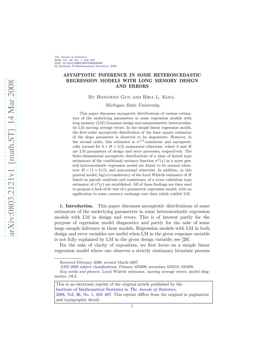 This paper discusses asymptotic distributions of various estimators of the underlying parameters in some regression models with long memory (LM) Gaussian design and nonparametric heteroscedastic LM moving average errors. In the simple linear regression model, the first-order asymptotic distribution of the least square estimator of the slope parameter is observed to be degenerate. However, in the second order, this estimator is -consistent and asymptotically normal for ; nonnormal otherwise, where and are LM parameters of design and error processes, respectively. The finite-dimensional asymptotic distributions of a class of kernel type estimators of the conditional variance function in a more general heteroscedastic regression model are found to be normal whenever , and non-normal otherwise. In addition, in this general model, -consistency of the local Whittle estimator of based on pseudo residuals and consistency of a cross validation type estimator of are established. All of these findings are then used to propose a lack-of-fit test of a parametric regression model, with an application to some currency exchange rate data which exhibit LM.