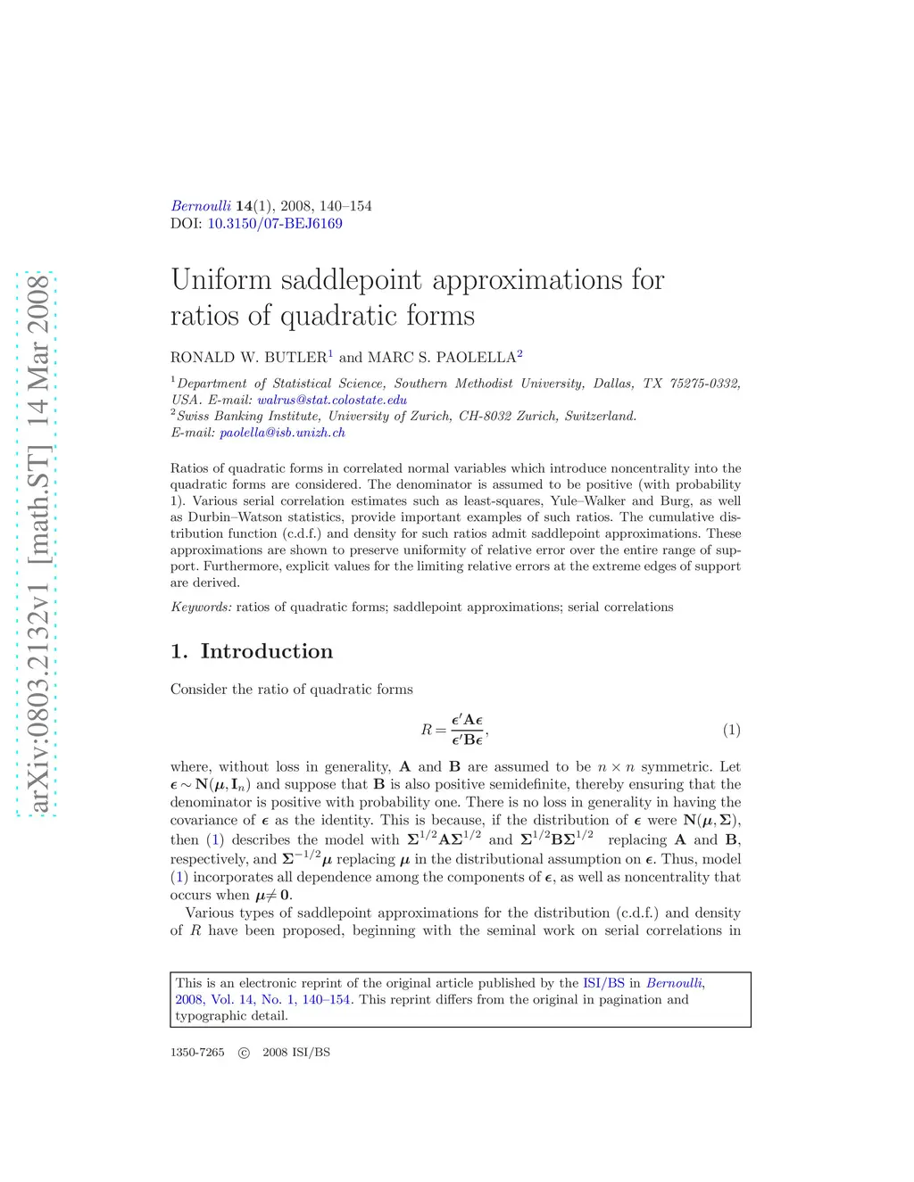 Ratios of quadratic forms in correlated normal variables which introduce noncentrality into the quadratic forms are considered. The denominator is assumed to be positive (with probability 1). Various serial correlation estimates such as least-squares, Yule--Walker and Burg, as well as Durbin--Watson statistics, provide important examples of such ratios. The cumulative distribution function (c.d.f.) and density for such ratios admit saddlepoint approximations. These approximations are shown to preserve uniformity of relative error over the entire range of support. Furthermore, explicit values for the limiting relative errors at the extreme edges of support are derived.