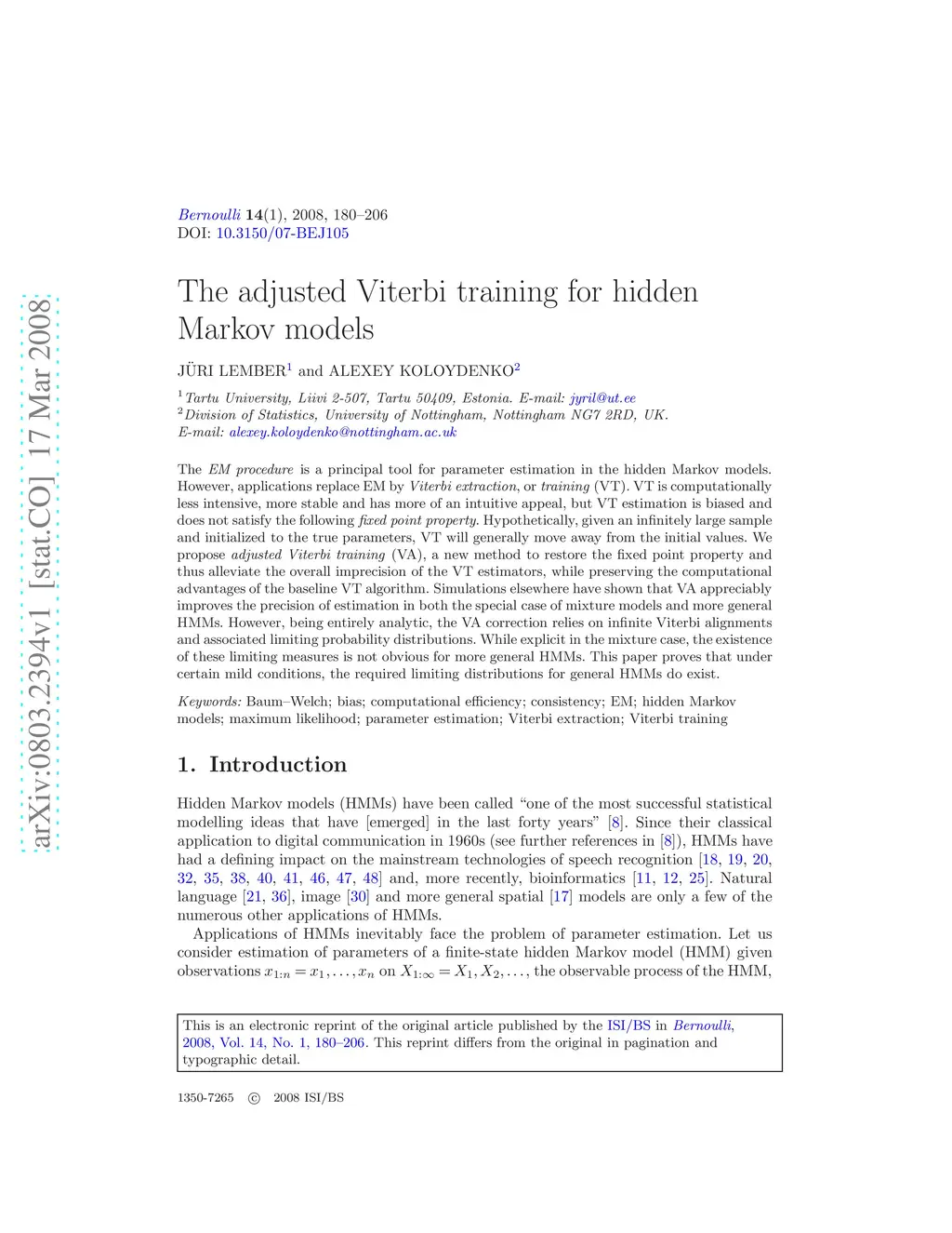 The EM procedure is a principal tool for parameter estimation in the hidden Markov models. However, applications replace EM by Viterbi extraction, or training (VT). VT is computationally less intensive, more stable and has more of an intuitive appeal, but VT estimation is biased and does not satisfy the following fixed point property. Hypothetically, given an infinitely large sample and initialized to the true parameters, VT will generally move away from the initial values. We propose adjusted Viterbi training (VA), a new method to restore the fixed point property and thus alleviate the overall imprecision of the VT estimators, while preserving the computational advantages of the baseline VT algorithm. Simulations elsewhere have shown that VA appreciably improves the precision of estimation in both the special case of mixture models and more general HMMs. However, being entirely analytic, the VA correction relies on infinite Viterbi alignments and associated limiting probability distributions. While explicit in the mixture case, the existence of these limiting measures is not obvious for more general HMMs. This paper proves that under certain mild conditions, the required limiting distributions for general HMMs do exist.