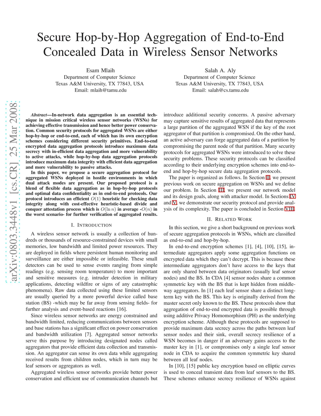 In-network data aggregation is an essential technique in mission critical wireless sensor networks (WSNs) for achieving effective transmission and hence better power conservation. Common security protocols for aggregated WSNs are either hop-by-hop or end-to-end, each of which has its own encryption schemes considering different security primitives. End-to-end encrypted data aggregation protocols introduce maximum data secrecy with in-efficient data aggregation and more vulnerability to active attacks, while hop-by-hop data aggregation protocols introduce maximum data integrity with efficient data aggregation and more vulnerability to passive attacks. In this paper, we propose a secure aggregation protocol for aggregated WSNs deployed in hostile environments in which dual attack modes are present. Our proposed protocol is a blend of flexible data aggregation as in hop-by-hop protocols and optimal data confidentiality as in end-to-end protocols. Our protocol introduces an efficient O(1) heuristic for checking data integrity along with cost-effective heuristic-based divide and conquer attestation process which is in average -O(n) in the worst scenario- for further verification of aggregated results.