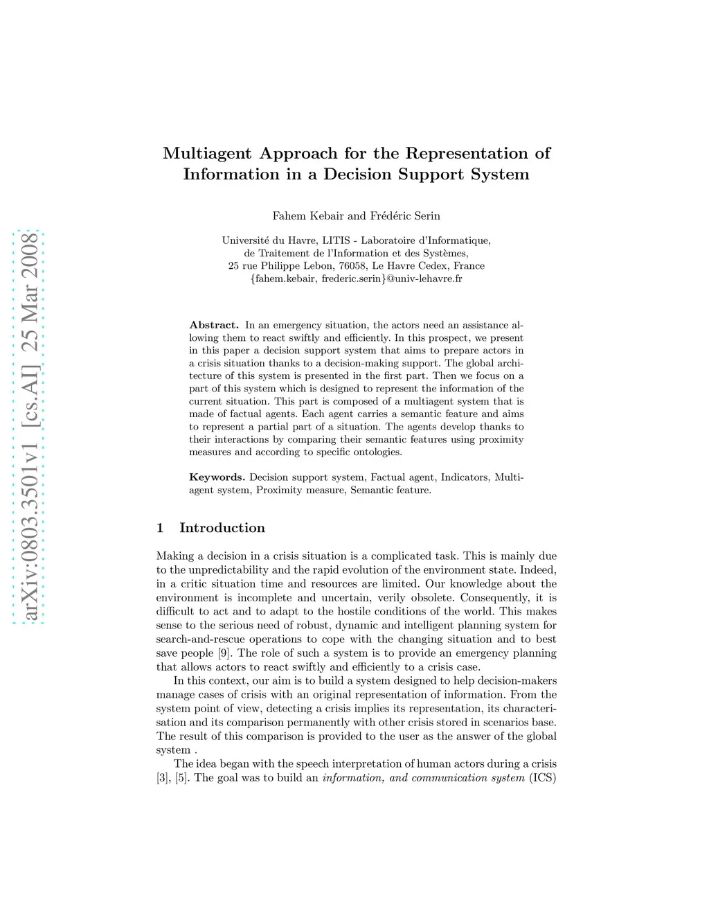 In an emergency situation, the actors need an assistance allowing them to react swiftly and efficiently. In this prospect, we present in this paper a decision support system that aims to prepare actors in a crisis situation thanks to a decision-making support. The global architecture of this system is presented in the first part. Then we focus on a part of this system which is designed to represent the information of the current situation. This part is composed of a multiagent system that is made of factual agents. Each agent carries a semantic feature and aims to represent a partial part of a situation. The agents develop thanks to their interactions by comparing their semantic features using proximity measures and according to specific ontologies.