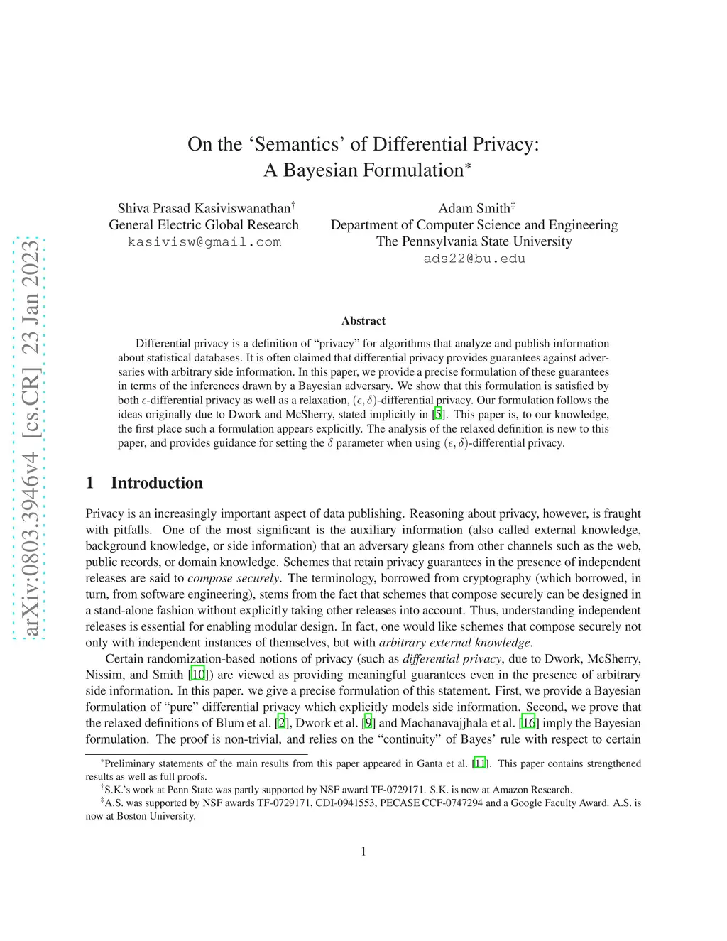 Differential privacy is a definition of "privacy'" for algorithms that analyze and publish information about statistical databases. It is often claimed that differential privacy provides guarantees against adversaries with arbitrary side information. In this paper, we provide a precise formulation of these guarantees in terms of the inferences drawn by a Bayesian adversary. We show that this formulation is satisfied by both "vanilla" differential privacy as well as a relaxation known as (epsilon,delta)-differential privacy. Our formulation follows the ideas originally due to Dwork and McSherry [Dwork 2006]. This paper is, to our knowledge, the first place such a formulation appears explicitly. The analysis of the relaxed definition is new to this paper, and provides some concrete guidance for setting parameters when using (epsilon,delta)-differential privacy.