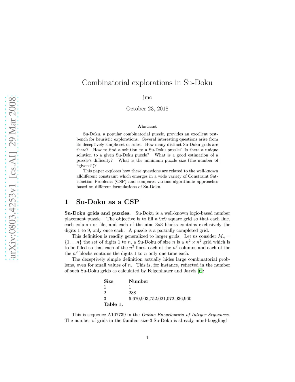 Su-Doku, a popular combinatorial puzzle, provides an excellent testbench for heuristic explorations. Several interesting questions arise from its deceptively simple set of rules. How many distinct Su-Doku grids are there? How to find a solution to a Su-Doku puzzle? Is there a unique solution to a given Su-Doku puzzle? What is a good estimation of a puzzle's difficulty? What is the minimum puzzle size (the number of "givens")? This paper explores how these questions are related to the well-known alldifferent constraint which emerges in a wide variety of Constraint Satisfaction Problems (CSP) and compares various algorithmic approaches based on different formulations of Su-Doku.