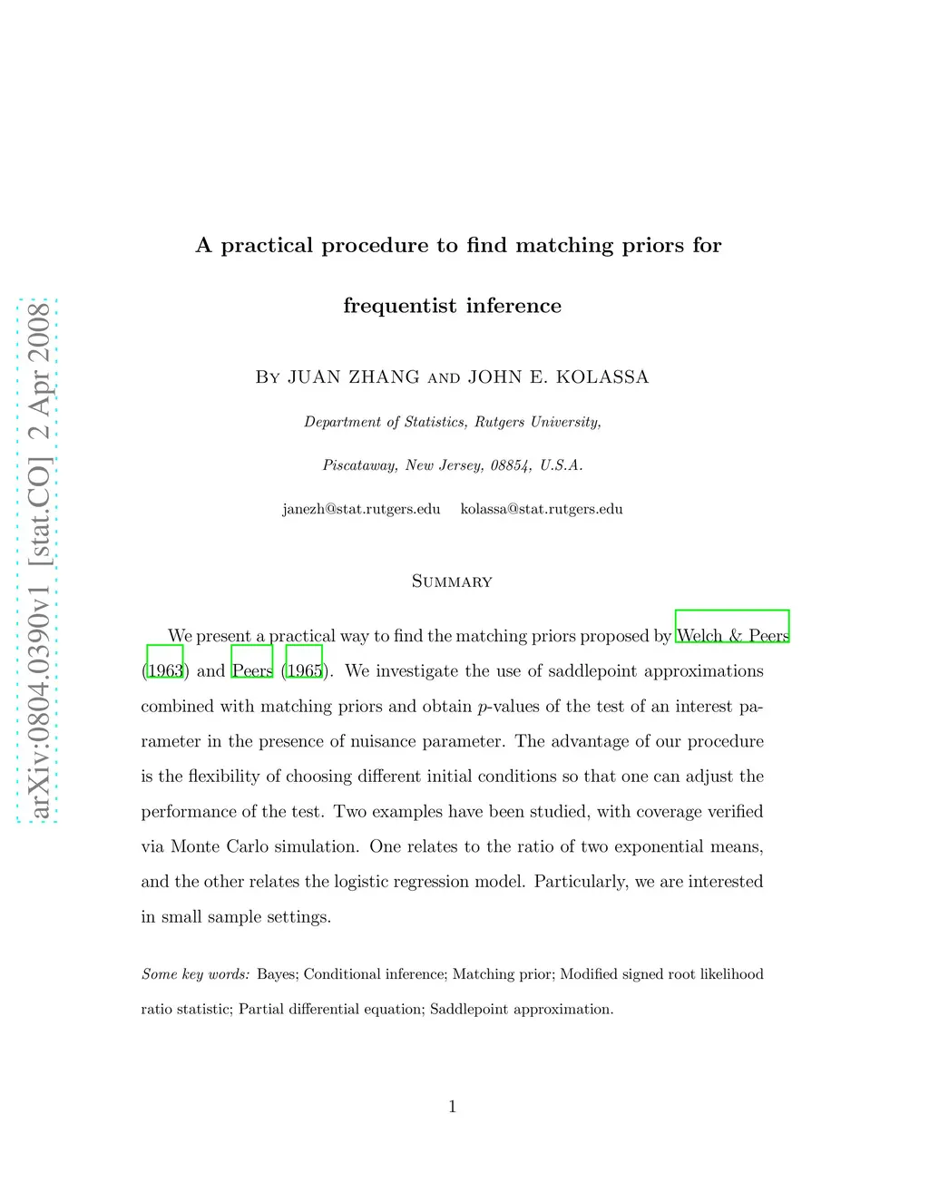 In the manuscript, we present a practical way to find the matching priors proposed by Welch & Peers (1963) and Peers (1965). We investigate the use of saddlepoint approximations combined with matching priors and obtain p-values of the test of an interest parameter in the presence of nuisance parameter. The advantage of our procedure is the flexibility of choosing different initial conditions so that one can adjust the performance of the test. Two examples have been studied, with coverage verified via Monte Carlo simulation. One relates to the ratio of two exponential means, and the other relates the logistic regression model. Particularly, we are interested in small sample settings.