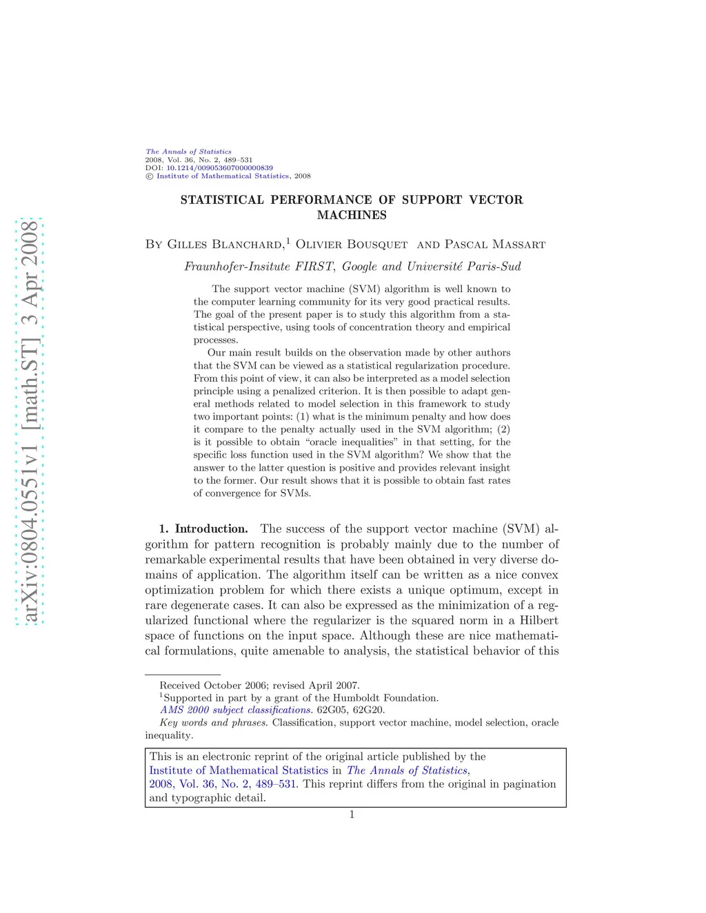 The support vector machine (SVM) algorithm is well known to the computer learning community for its very good practical results. The goal of the present paper is to study this algorithm from a statistical perspective, using tools of concentration theory and empirical processes. Our main result builds on the observation made by other authors that the SVM can be viewed as a statistical regularization procedure. From this point of view, it can also be interpreted as a model selection principle using a penalized criterion. It is then possible to adapt general methods related to model selection in this framework to study two important points: (1) what is the minimum penalty and how does it compare to the penalty actually used in the SVM algorithm; (2) is it possible to obtain ``oracle inequalities'' in that setting, for the specific loss function used in the SVM algorithm? We show that the answer to the latter question is positive and provides relevant insight to the former. Our result shows that it is possible to obtain fast rates of convergence for SVMs.