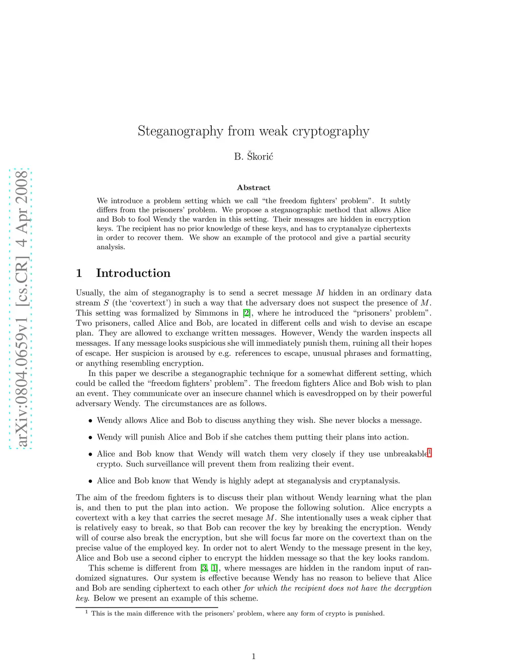 We introduce a problem setting which we call ``the freedom fighters' problem''. It subtly differs from the prisoners' problem. We propose a steganographic method that allows Alice and Bob to fool Wendy the warden in this setting. Their messages are hidden in encryption keys. The recipient has no prior knowledge of these keys, and has to cryptanalyze ciphertexts in order to recover them. We show an example of the protocol and give a partial security analysis.