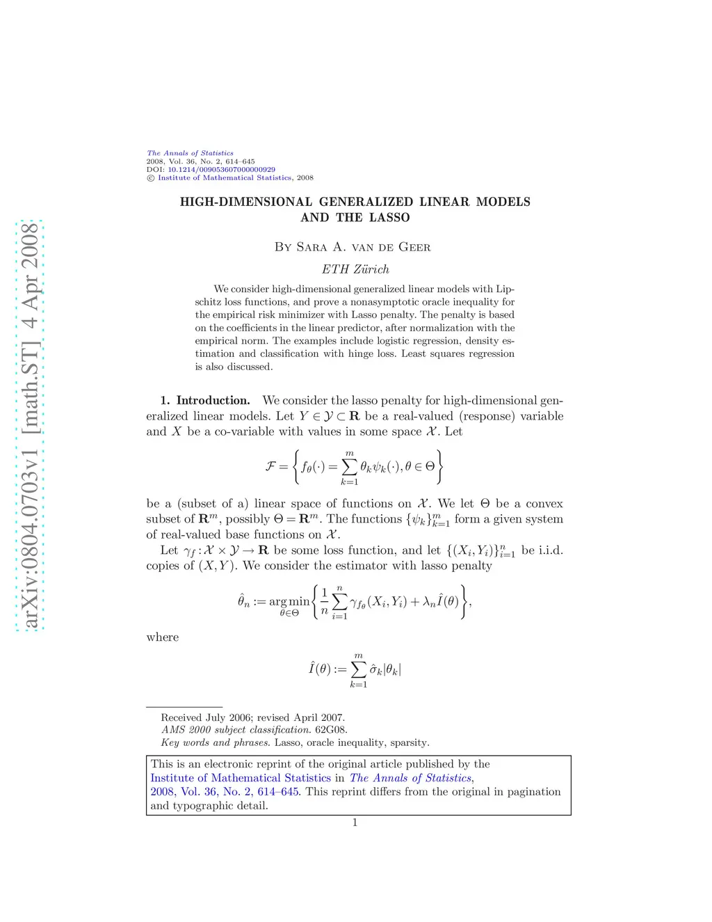 We consider high-dimensional generalized linear models with Lipschitz loss functions, and prove a nonasymptotic oracle inequality for the empirical risk minimizer with Lasso penalty. The penalty is based on the coefficients in the linear predictor, after normalization with the empirical norm. The examples include logistic regression, density estimation and classification with hinge loss. Least squares regression is also discussed.