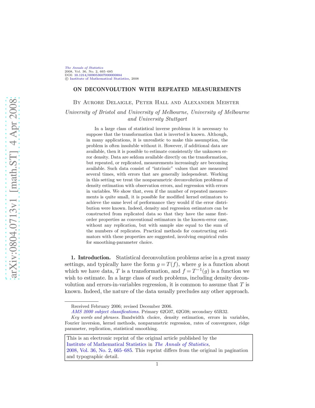 In a large class of statistical inverse problems it is necessary to suppose that the transformation that is inverted is known. Although, in many applications, it is unrealistic to make this assumption, the problem is often insoluble without it. However, if additional data are available, then it is possible to estimate consistently the unknown error density. Data are seldom available directly on the transformation, but repeated, or replicated, measurements increasingly are becoming available. Such data consist of ``intrinsic'' values that are measured several times, with errors that are generally independent. Working in this setting we treat the nonparametric deconvolution problems of density estimation with observation errors, and regression with errors in variables. We show that, even if the number of repeated measurements is quite small, it is possible for modified kernel estimators to achieve the same level of performance they would if the error distribution were known. Indeed, density and regression estimators can be constructed from replicated data so that they have the same first-order properties as conventional estimators in the known-error case, without any replication, but with sample size equal to the sum of the numbers of replicates. Practical methods for constructing estimators with these properties are suggested, involving empirical rules for smoothing-parameter choice.