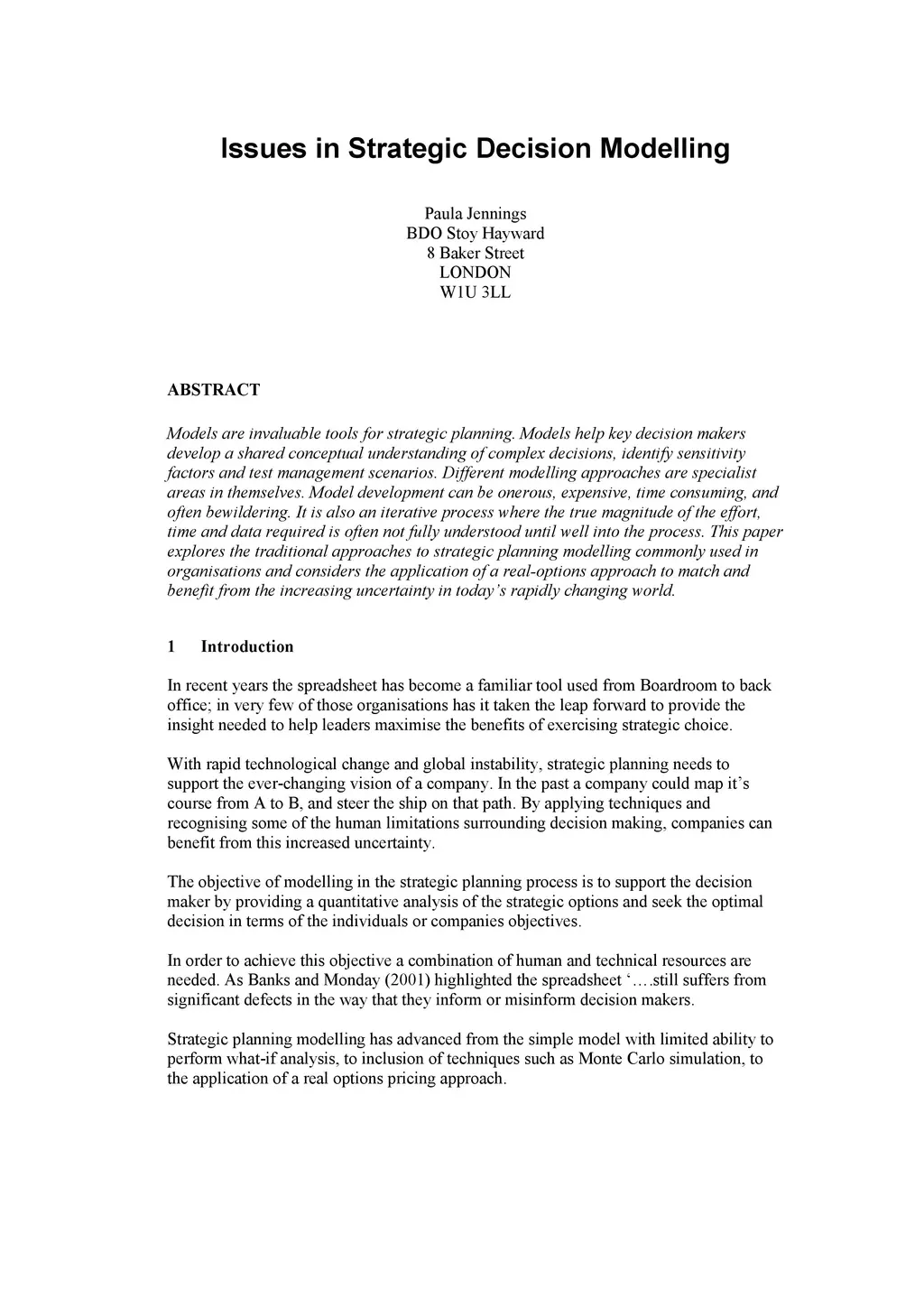 [Spreadsheet] Models are invaluable tools for strategic planning. Models help key decision makers develop a shared conceptual understanding of complex decisions, identify sensitivity factors and test management scenarios. Different modelling approaches are specialist areas in themselves. Model development can be onerous, expensive, time consuming, and often bewildering. It is also an iterative process where the true magnitude of the effort, time and data required is often not fully understood until well into the process. This paper explores the traditional approaches to strategic planning modelling commonly used in organisations and considers the application of a real-options approach to match and benefit from the increasing uncertainty in today's rapidly changing world.