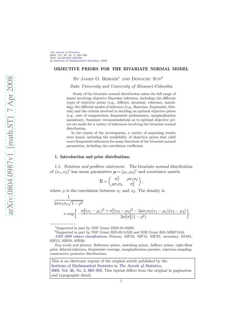 Study of the bivariate normal distribution raises the full range of issues involving objective Bayesian inference, including the different types of objective priors (e.g., Jeffreys, invariant, reference, matching), the different modes of inference (e.g., Bayesian, frequentist, fiducial) and the criteria involved in deciding on optimal objective priors (e.g., ease of computation, frequentist performance, marginalization paradoxes). Summary recommendations as to optimal objective priors are made for a variety of inferences involving the bivariate normal distribution. In the course of the investigation, a variety of surprising results were found, including the availability of objective priors that yield exact frequentist inferences for many functions of the bivariate normal parameters, including the correlation coefficient.