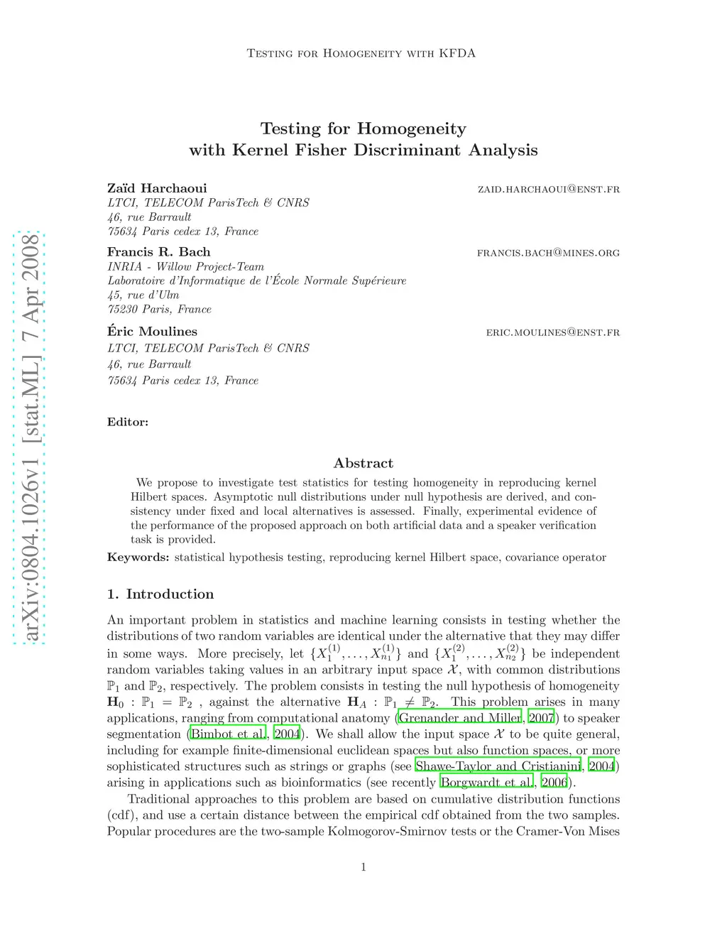 Testing for Homogeneity with Kernel Fisher Discriminant Analysis