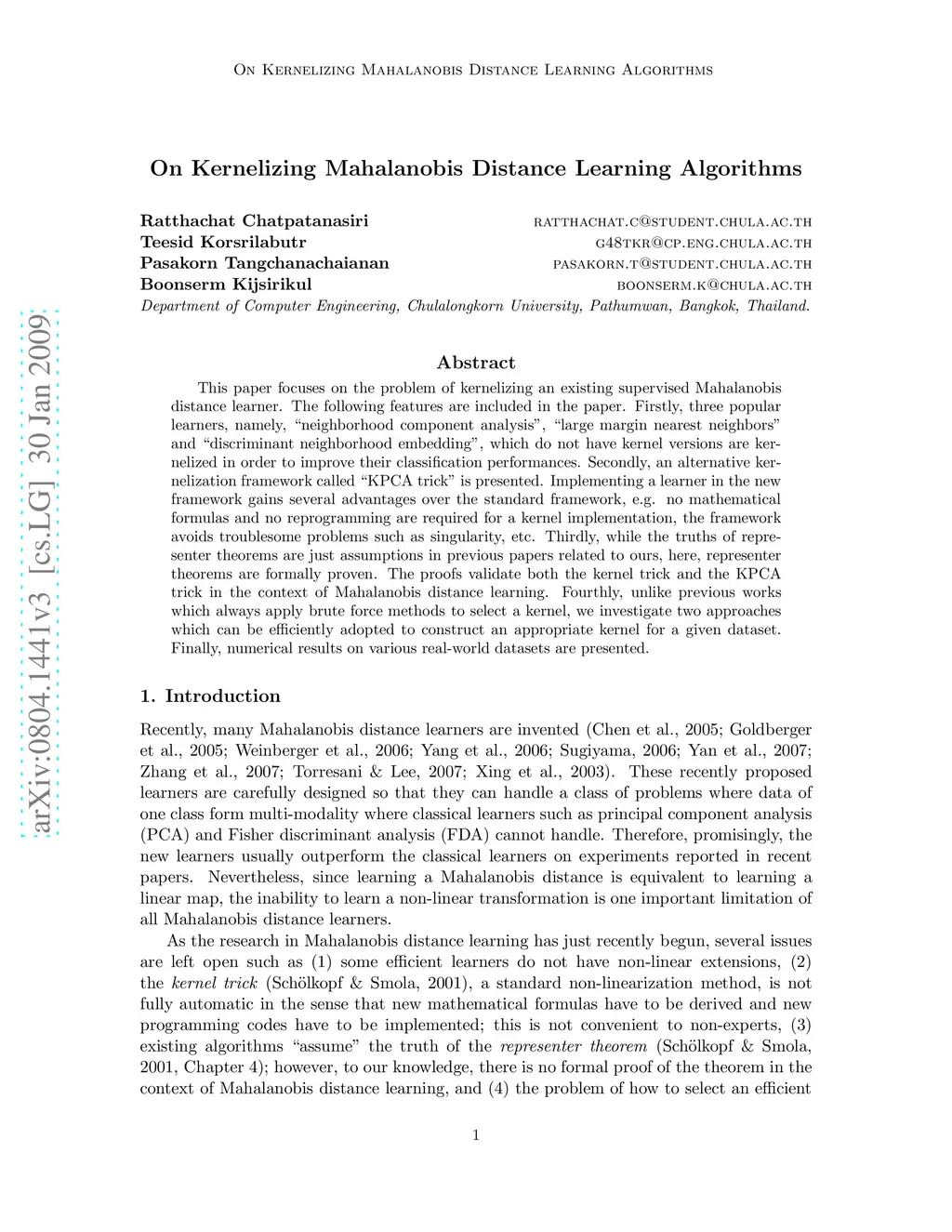 This paper focuses on the problem of kernelizing an existing supervised Mahalanobis distance learner. The following features are included in the paper. Firstly, three popular learners, namely, "neighborhood component analysis", "large margin nearest neighbors" and "discriminant neighborhood embedding", which do not have kernel versions are kernelized in order to improve their classification performances. Secondly, an alternative kernelization framework called "KPCA trick" is presented. Implementing a learner in the new framework gains several advantages over the standard framework, e.g. no mathematical formulas and no reprogramming are required for a kernel implementation, the framework avoids troublesome problems such as singularity, etc. Thirdly, while the truths of representer theorems are just assumptions in previous papers related to ours, here, representer theorems are formally proven. The proofs validate both the kernel trick and the KPCA trick in the context of Mahalanobis distance learning. Fourthly, unlike previous works which always apply brute force methods to select a kernel, we investigate two approaches which can be efficiently adopted to construct an appropriate kernel for a given dataset. Finally, numerical results on various real-world datasets are presented.