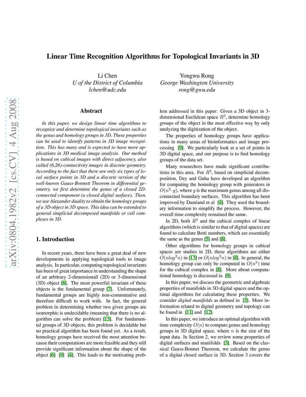In this paper, we design linear time algorithms to recognize and determine topological invariants such as the genus and homology groups in 3D. These properties can be used to identify patterns in 3D image recognition. This has tremendous amount of applications in 3D medical image analysis. Our method is based on cubical images with direct adjacency, also called (6,26)-connectivity images in discrete geometry. According to the fact that there are only six types of local surface points in 3D and a discrete version of the well-known Gauss-Bonnett Theorem in differential geometry, we first determine the genus of a closed 2D-connected component (a closed digital surface). Then, we use Alexander duality to obtain the homology groups of a 3D object in 3D space.