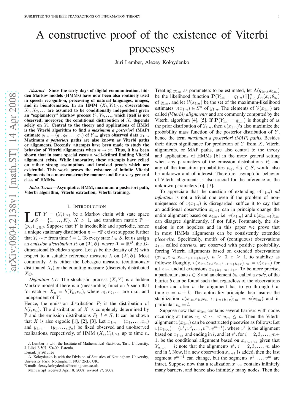 Since the early days of digital communication, hidden Markov models (HMMs) have now been also routinely used in speech recognition, processing of natural languages, images, and in bioinformatics. In an HMM , observations are assumed to be conditionally independent given an ``explanatory'' Markov process , which itself is not observed; moreover, the conditional distribution of depends solely on . Central to the theory and applications of HMM is the Viterbi algorithm to find {\em a maximum a posteriori} (MAP) estimate of given observed data . Maximum {\em a posteriori} paths are also known as Viterbi paths or alignments. Recently, attempts have been made to study the behavior of Viterbi alignments when . Thus, it has been shown that in some special cases a well-defined limiting Viterbi alignment exists. While innovative, these attempts have relied on rather strong assumptions and involved proofs which are existential. This work proves the existence of infinite Viterbi alignments in a more constructive manner and for a very general class of HMMs.