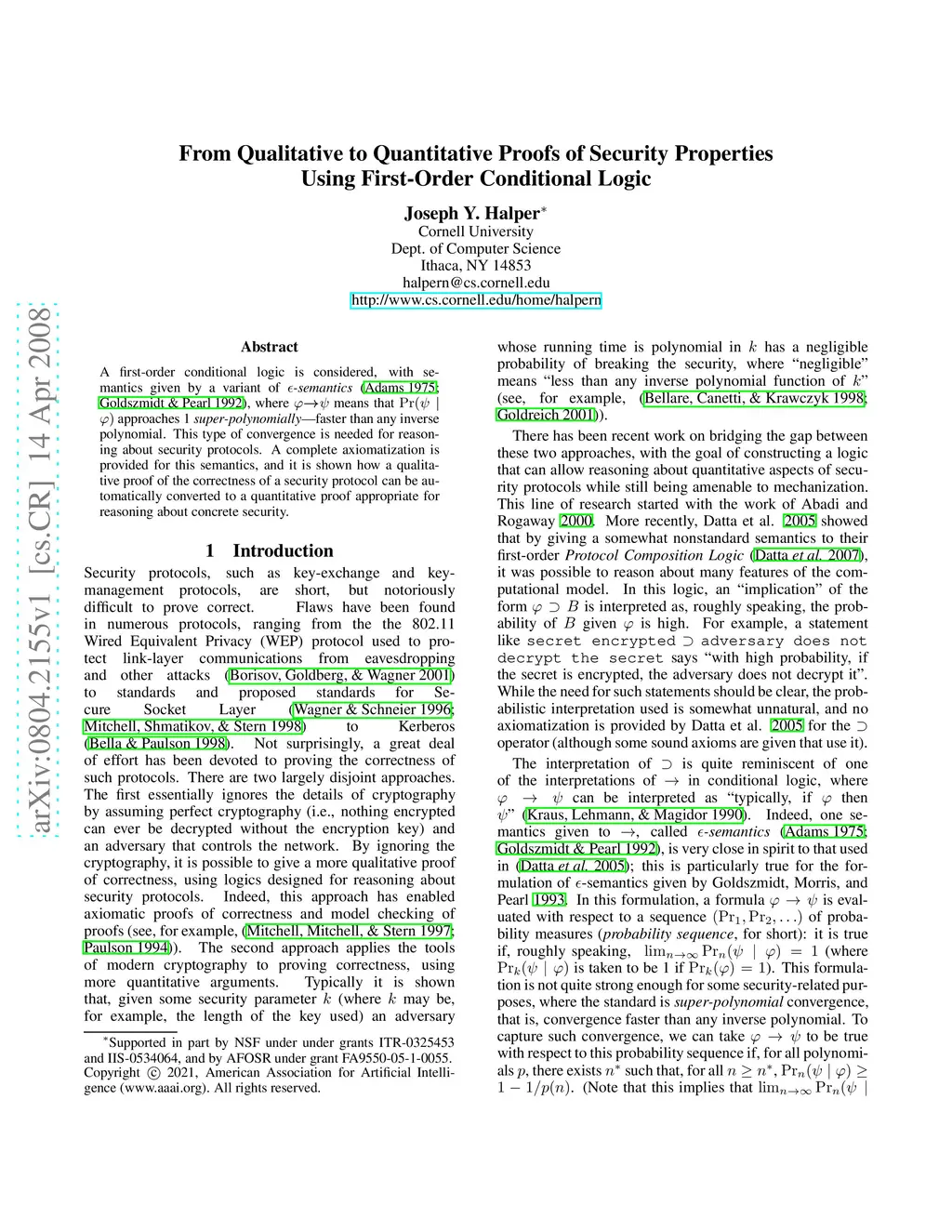 A first-order conditional logic is considered, with semantics given by a variant of epsilon-semantics, where p -> q means that Pr(q | p) approaches 1 super-polynomially --faster than any inverse polynomial. This type of convergence is needed for reasoning about security protocols. A complete axiomatization is provided for this semantics, and it is shown how a qualitative proof of the correctness of a security protocol can be automatically converted to a quantitative proof appropriate for reasoning about concrete security.