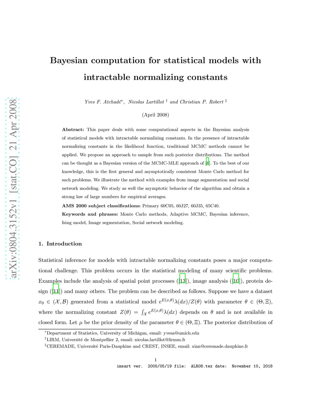 This paper deals with some computational aspects in the Bayesian analysis of statistical models with intractable normalizing constants. In the presence of intractable normalizing constants in the likelihood function, traditional MCMC methods cannot be applied. We propose an approach to sample from such posterior distributions. The method can be thought as a Bayesian version of the MCMC-MLE approach of Geyer and Thompson (1992). To the best of our knowledge, this is the first general and asymptotically consistent Monte Carlo method for such problems. We illustrate the method with examples from image segmentation and social network modeling. We study as well the asymptotic behavior of the algorithm and obtain a strong law of large numbers for empirical averages.