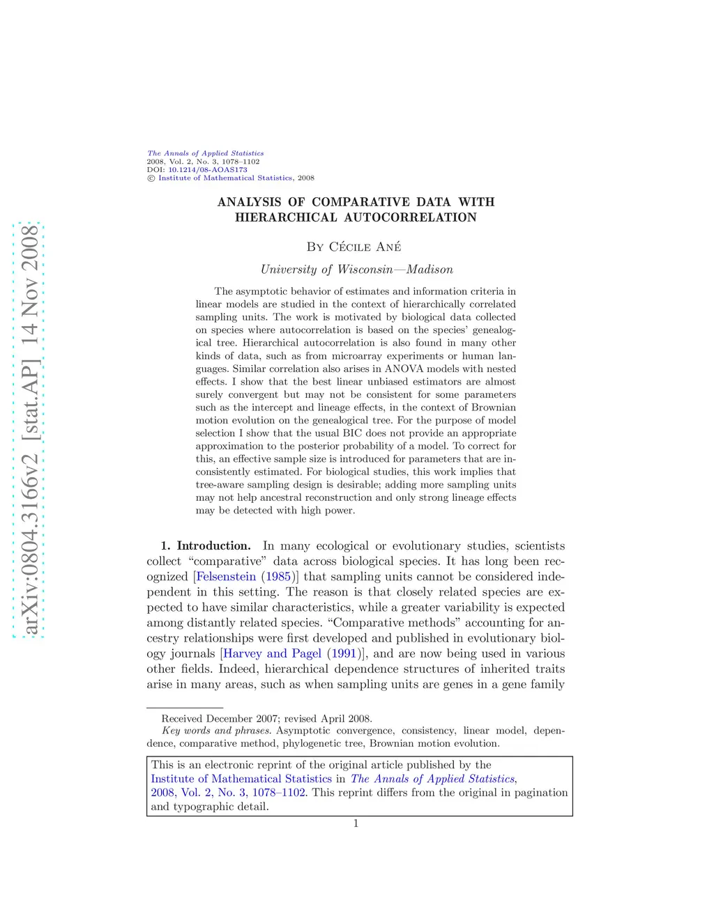 The asymptotic behavior of estimates and information criteria in linear models are studied in the context of hierarchically correlated sampling units. The work is motivated by biological data collected on species where autocorrelation is based on the species' genealogical tree. Hierarchical autocorrelation is also found in many other kinds of data, such as from microarray experiments or human languages. Similar correlation also arises in ANOVA models with nested effects. I show that the best linear unbiased estimators are almost surely convergent but may not be consistent for some parameters such as the intercept and lineage effects, in the context of Brownian motion evolution on the genealogical tree. For the purpose of model selection I show that the usual BIC does not provide an appropriate approximation to the posterior probability of a model. To correct for this, an effective sample size is introduced for parameters that are inconsistently estimated. For biological studies, this work implies that tree-aware sampling design is desirable; adding more sampling units may not help ancestral reconstruction and only strong lineage effects may be detected with high power.