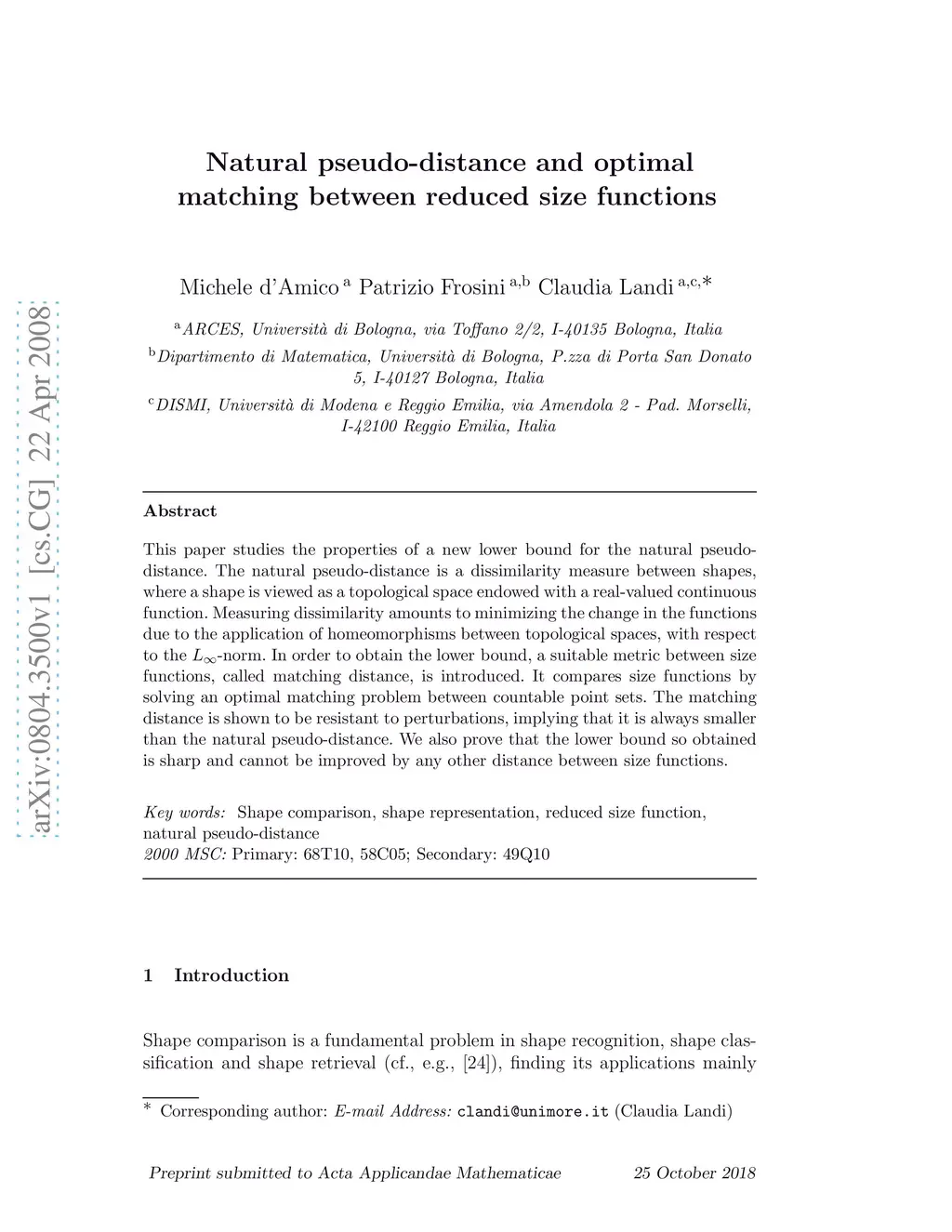 This paper studies the properties of a new lower bound for the natural pseudo-distance. The natural pseudo-distance is a dissimilarity measure between shapes, where a shape is viewed as a topological space endowed with a real-valued continuous function. Measuring dissimilarity amounts to minimizing the change in the functions due to the application of homeomorphisms between topological spaces, with respect to the -norm. In order to obtain the lower bound, a suitable metric between size functions, called matching distance, is introduced. It compares size functions by solving an optimal matching problem between countable point sets. The matching distance is shown to be resistant to perturbations, implying that it is always smaller than the natural pseudo-distance. We also prove that the lower bound so obtained is sharp and cannot be improved by any other distance between size functions.